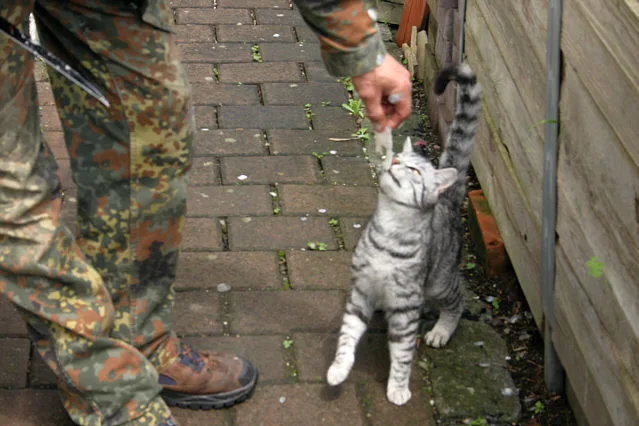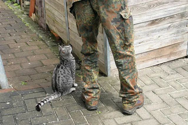 Oder wenn er vom Fischen kam und die Fische hinten beim Komposthaufen ausgenommen hat, dann stand der Kater schon dort und wartete bis er was bekam.