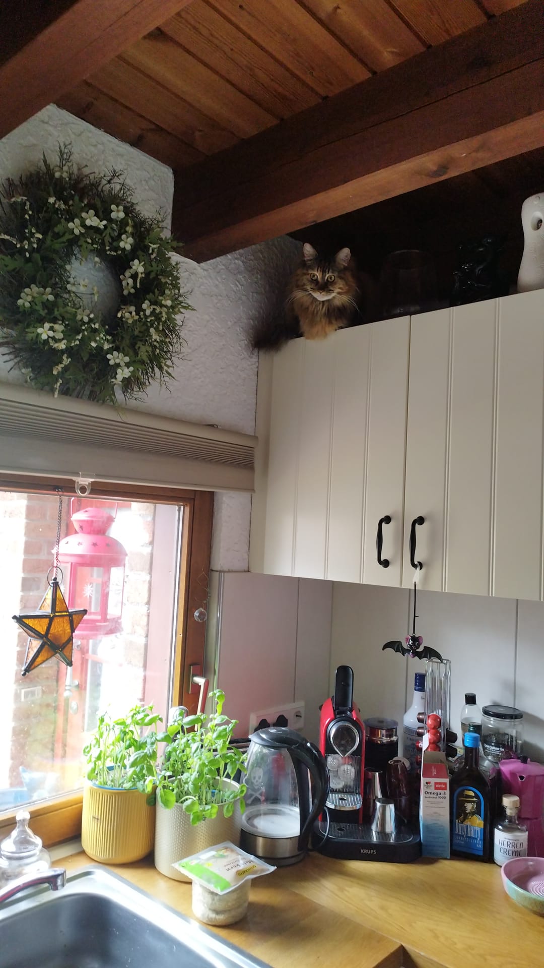 Tatsächlich springt sie von der Arbeitsplatte aus dem Stand hoch, sie ist eine unglaublich gute Springerin und Kletterin.... Manchmal wundere ich mich auch sehr:Wie kommt sie denn da hoch,über die Vorhangstange etwa ?