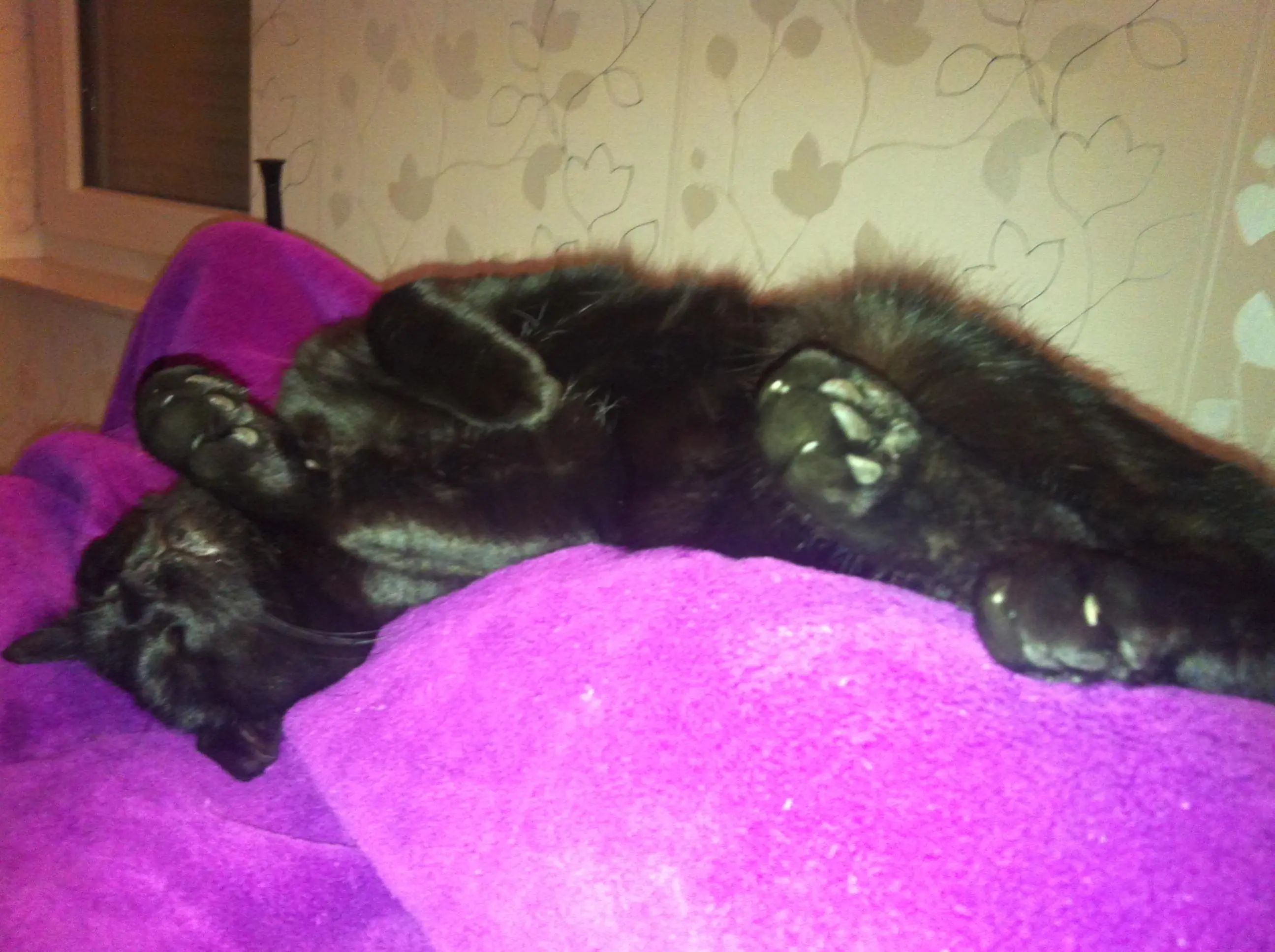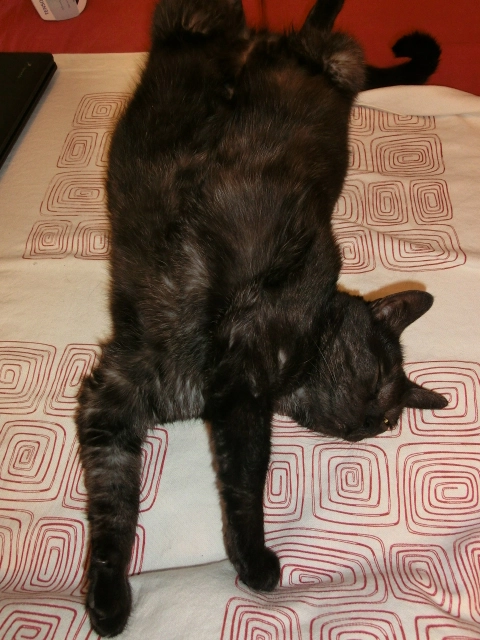 Dein schwarzer Stubentiger schläft ja genauso wie meiner. Schön auf dem Rücken liegen und sich den dicken Bauch streicheln lassen.