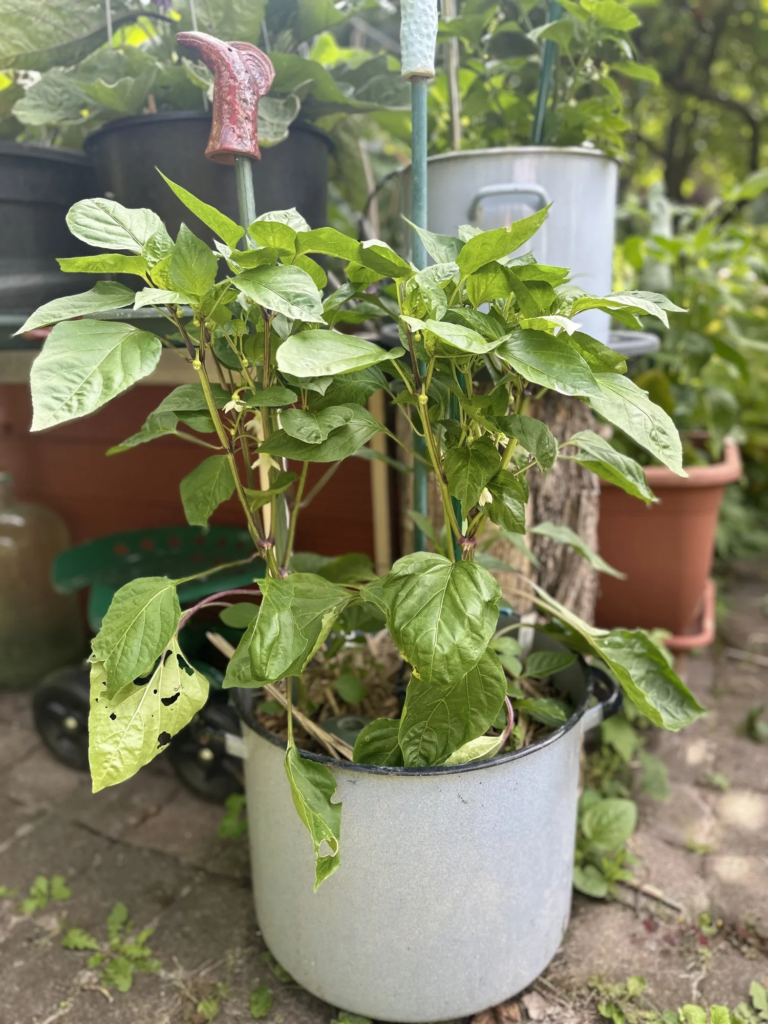 Ich stütze nur, wenn es nötig ist. Eine Paprika mit recht großen schweren Früchten habe ich neulich angebunden, da sie die meisten Früchte zu einer Seite hat und etwas in Schieflage geraten ist.Das ist ja super, @Tomatenliebe, jetzt habe ich gleich Infos