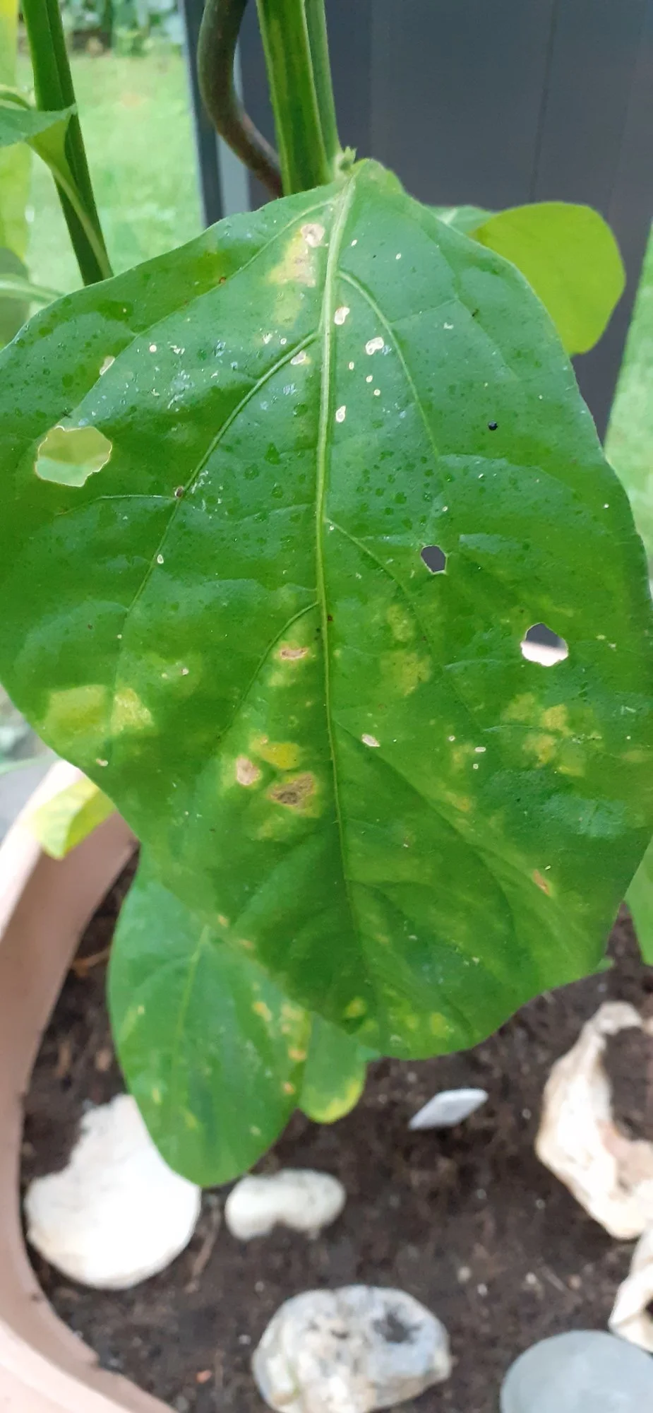Meine steht auch im Topf überdacht. Krautfäule kann ich mir nicht so richtig vorstellen. Erstens steht sie vor Regen geschützt und zweitens müsste man dann an der Blattunterseite einen Schimmelrasen sehen und der Schaden müsste sich vom Blattrand her ausbreiten. Das sieht auch ganz anders aus.