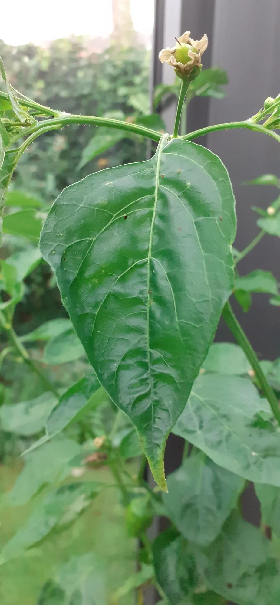 Eine meiner Paprika Pflanzen im Topf hat seltsame Blätter. Die älteren Bätter sind normal, die ganz jungen auch.