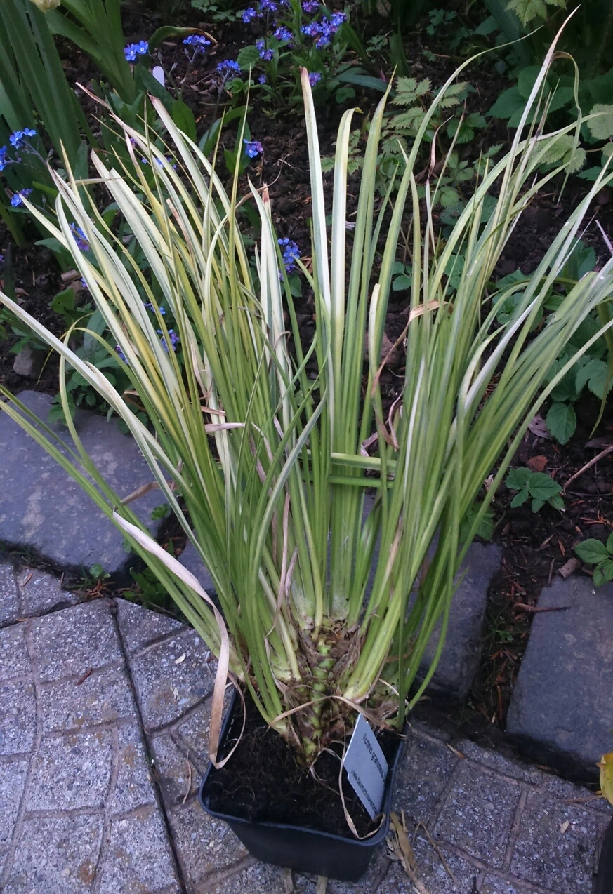 Das ist weißgestreifter Kalmus 'Ogon', kommt an den Teich und soll sich da ausbreiten