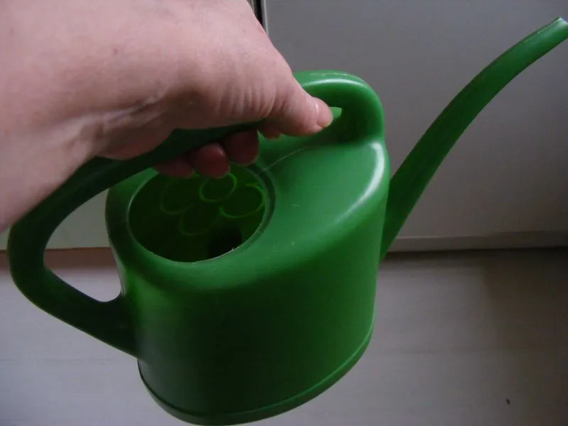 Die Neue läßt sich schlecht befüllen, der Henkel ist genau über dem Wassereinfülloch. Außerdem kann auch der Nichtkriminalist leicht erkennen, wo der Zimmergärtner gerade entlang gegangen ist. Wenn man die Kanne nicht beim Tragen gut festhält und dabei leicht mit der Gießöffnung nach oben hält, hinterläßt man im Haus eine Tröpfelspur.