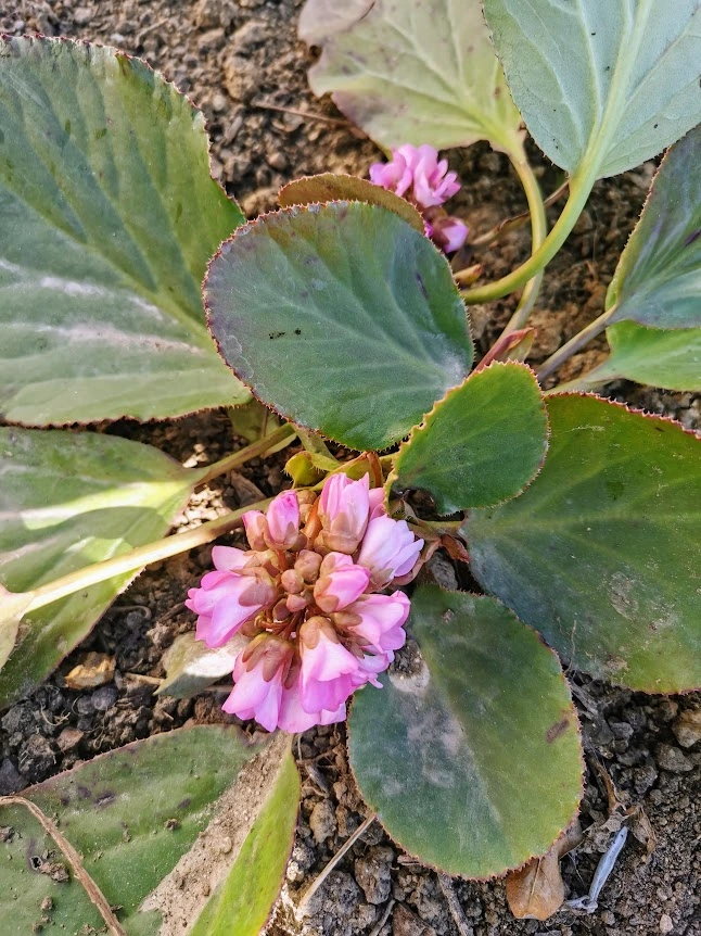 Bergenie ist richtig - bei mir blühen die schon...
