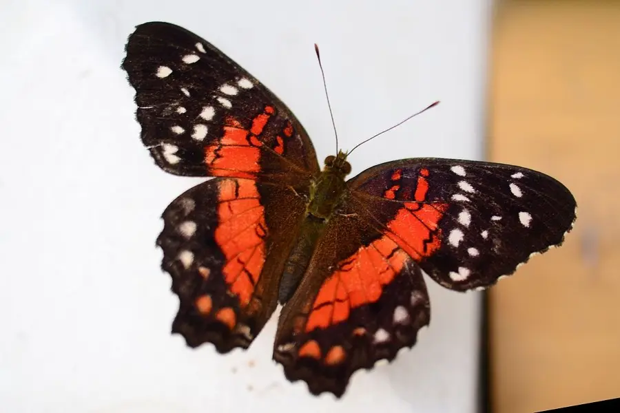 Es ist ein roter tropischer Schmetterling. Und so sieht er aus: