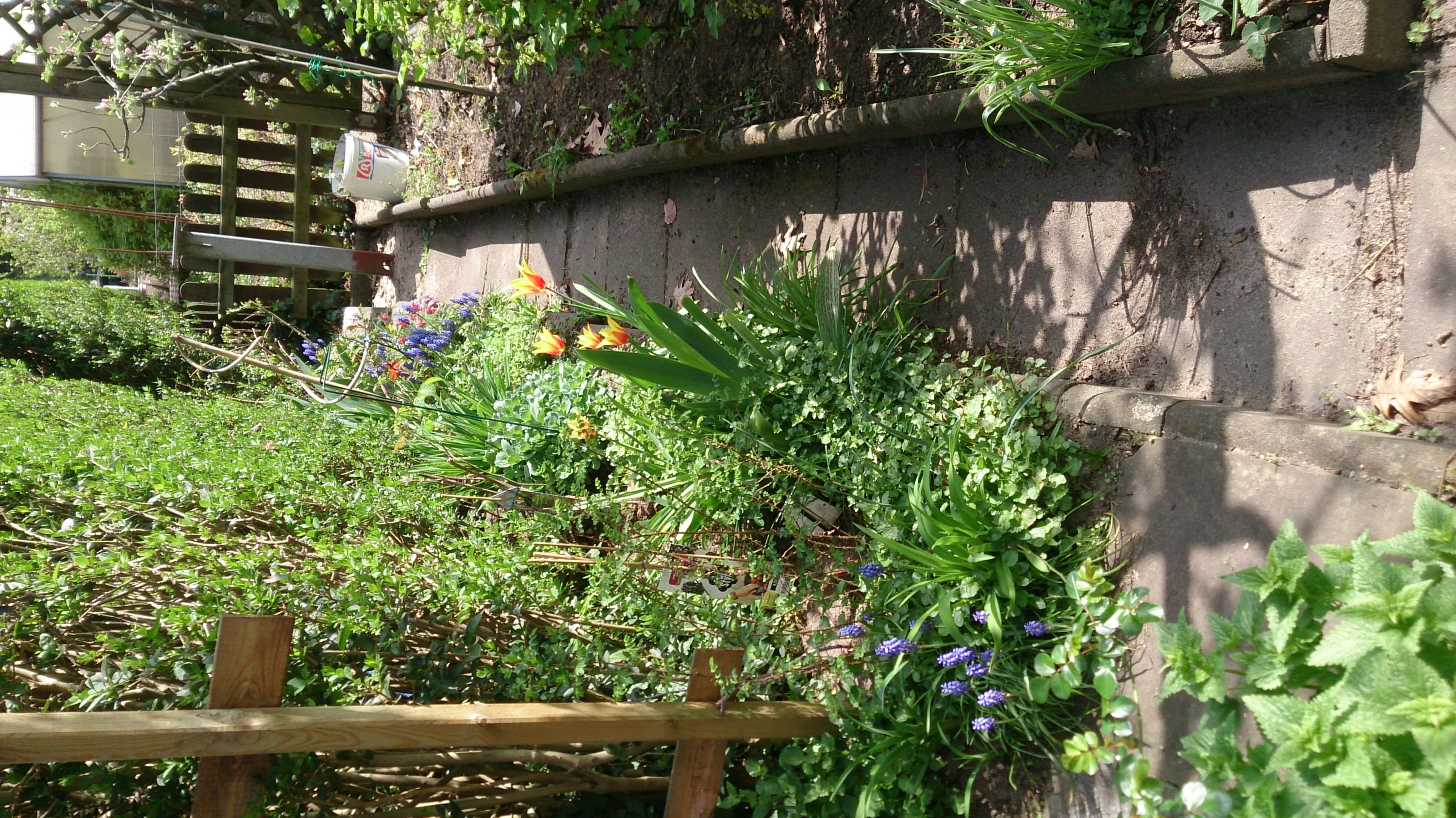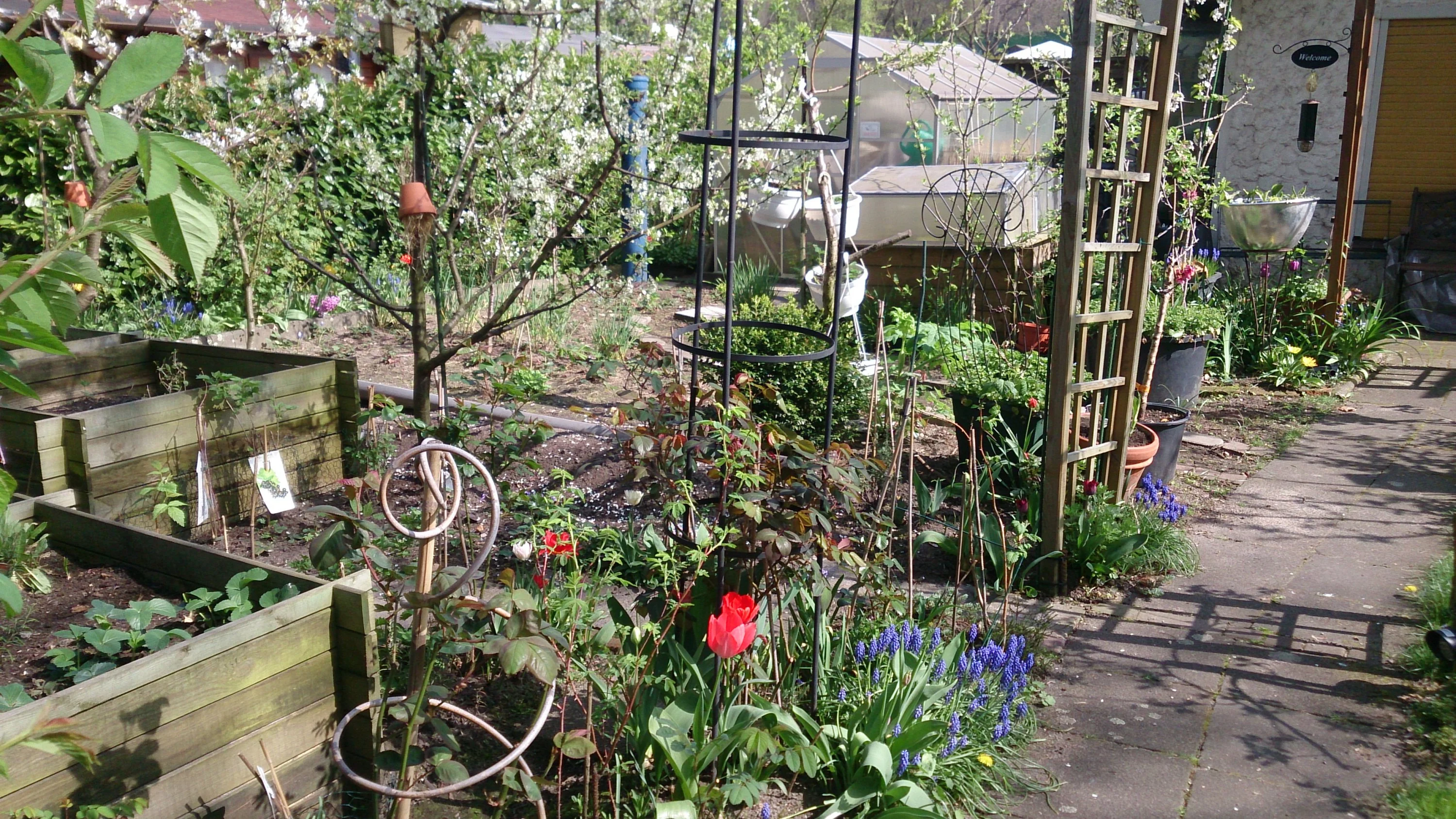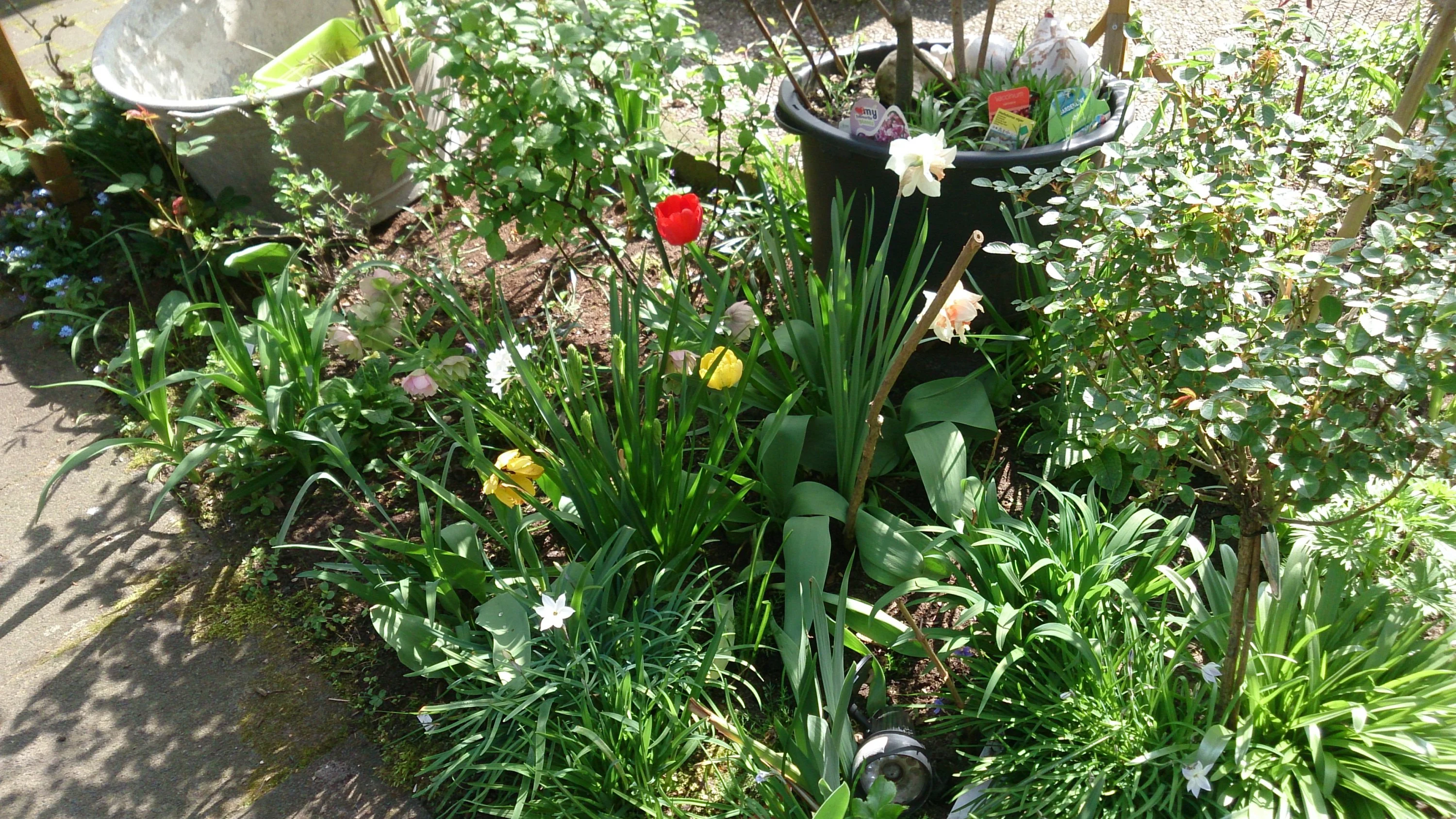 Gibt's denn auch schon Rosen an den Rosenbögen? Und aus was ist die Schale für den Miniteich? (Schade, dass ein paar Bilder auf dem Kopf stehen.) Die Farbe deiner dunkelroten Tulpen gefällt mir. Freue mich auf weitere Bilder!