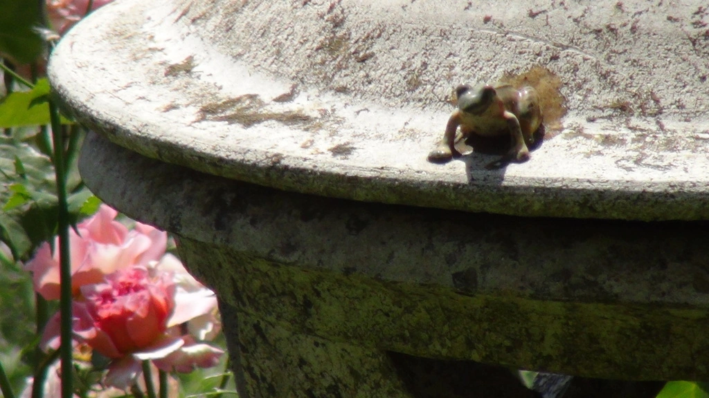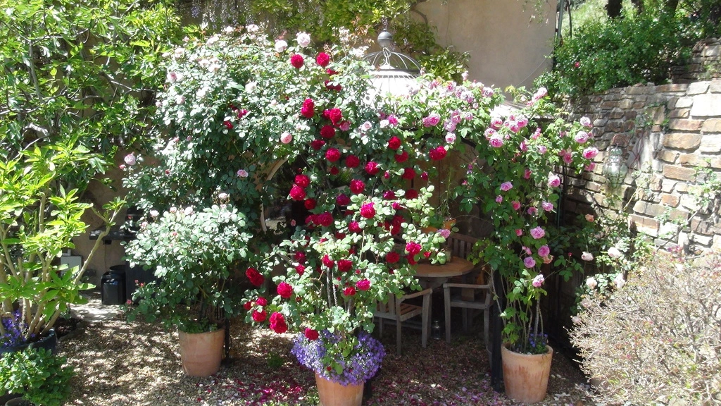 Darunter eine Bungainvillea. Rechts davon eine alte Gusseiserne Ofenplatte, die ich gerade als Wasserstelle der Kiesterrasse umbaue. Das rechte Bild mit dem Rosenpavillon auf der Kiesterrasse und unseren Essplatz.