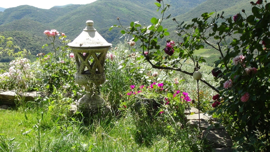 Der Steinkreis mit englischen Duftrosen und Campanula ist das Refugium der Schildkröten. Sie futtern fast alle Blüten.