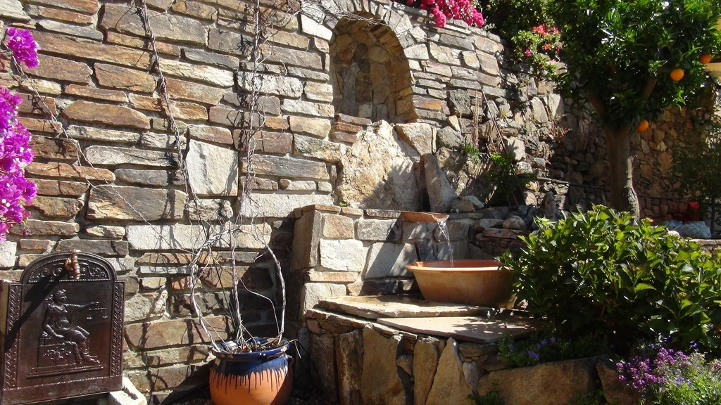 Eine Olivenwurzel, mit Schafherde, von einer Künstlerin aus den Bergen. Daneben die Grotte mit einem Wasserspiel.