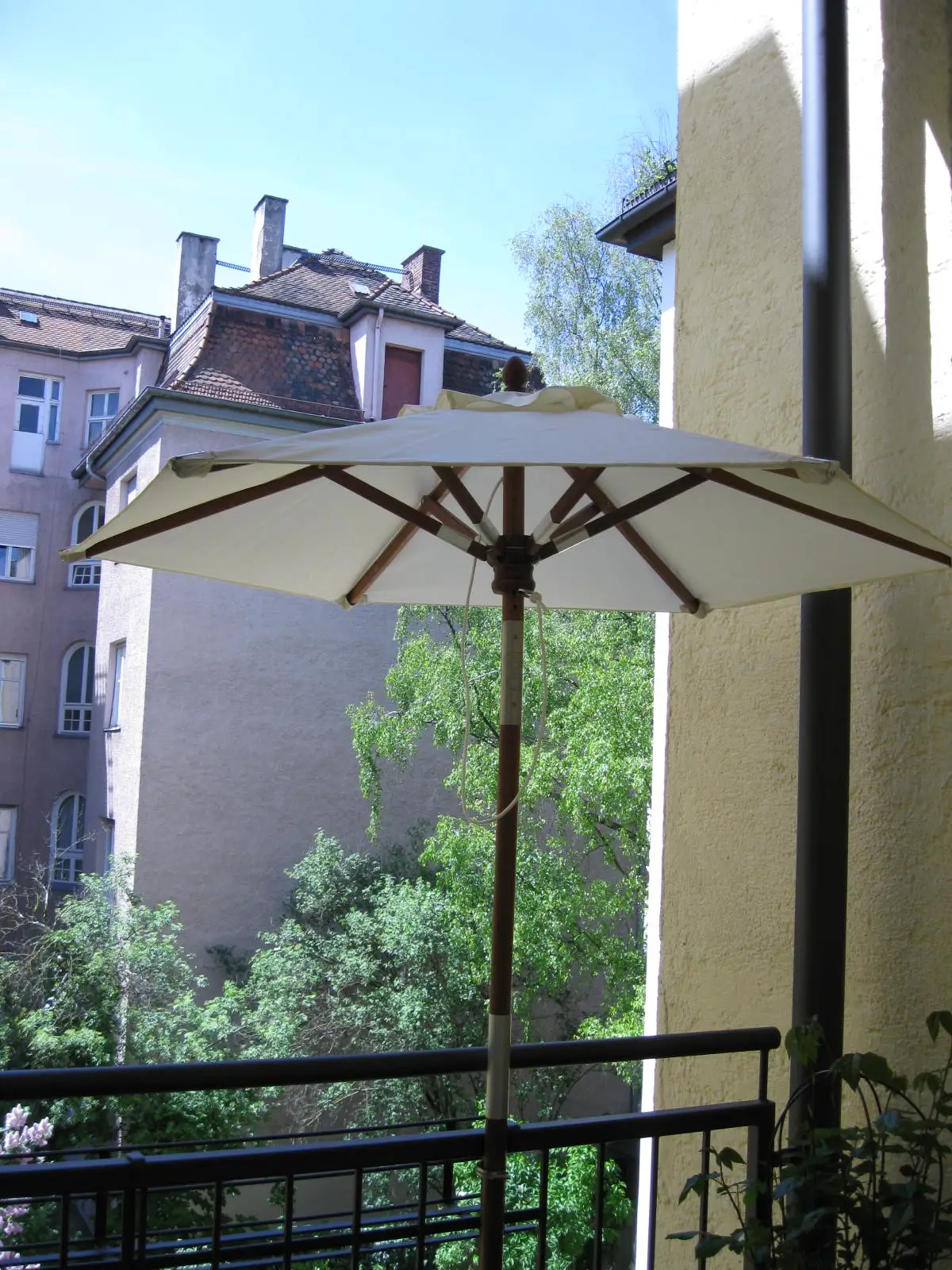 Eigentlich müsste ich die Küche ausräumen, wegen Malerarbeiten. Aber ich hab' lieber mein Schirmchen ans Geländer geschraubt. Sehr lauschig.