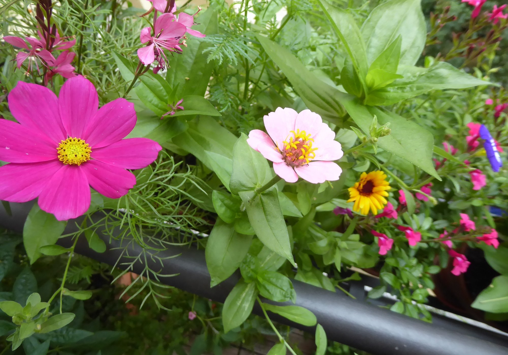 Die Spinnenblume schaut mittlerweile übers Geländer. Für zweifuffzich auf dem Wochenmarkt geshoppt. Zu ihren Füßen kämpft der Elfensporn ums Überleben.