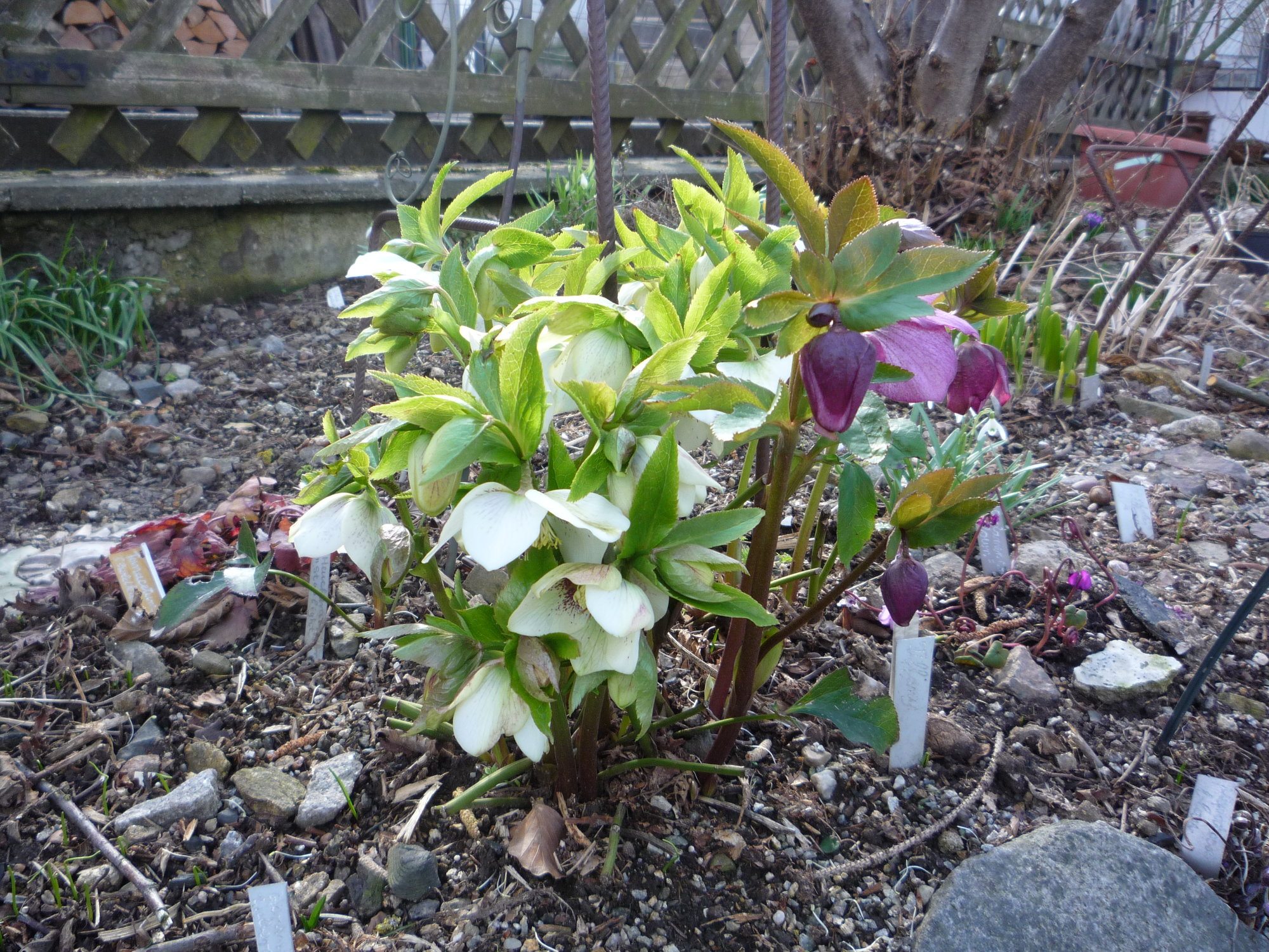 Wozu gehören denn die schöngestreiften Zungen, die neben und hinter der Primula juliae aus dem Boden schauen? Oder sind's Öhrchen - egal, erinnern mich an Tulpen, die ich mal hatte, die aber einfach verschwunden sind.