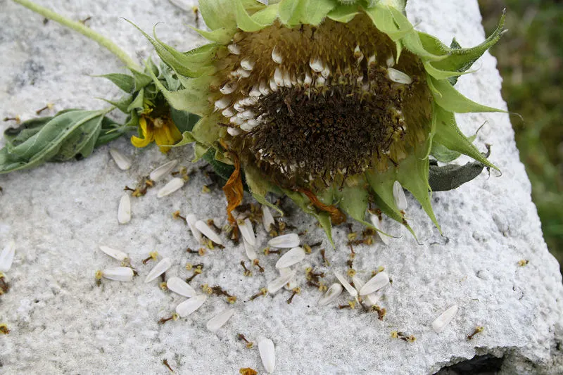 Die verblühten Sonnenblumen lege ich den Piepmätzen an ruhigen Stellen im Garten aus