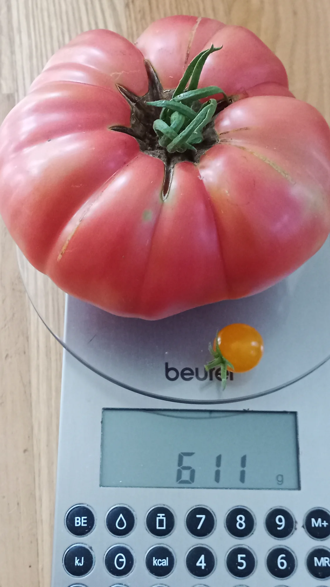 • Komisch, dass dieselbe Tomate beim Umdrehen 1 g zugenommen hat. HĂ€ngt vielleicht mit dem seltsamen Aussehen ihrer Unterseite zusammen ... :giggle: