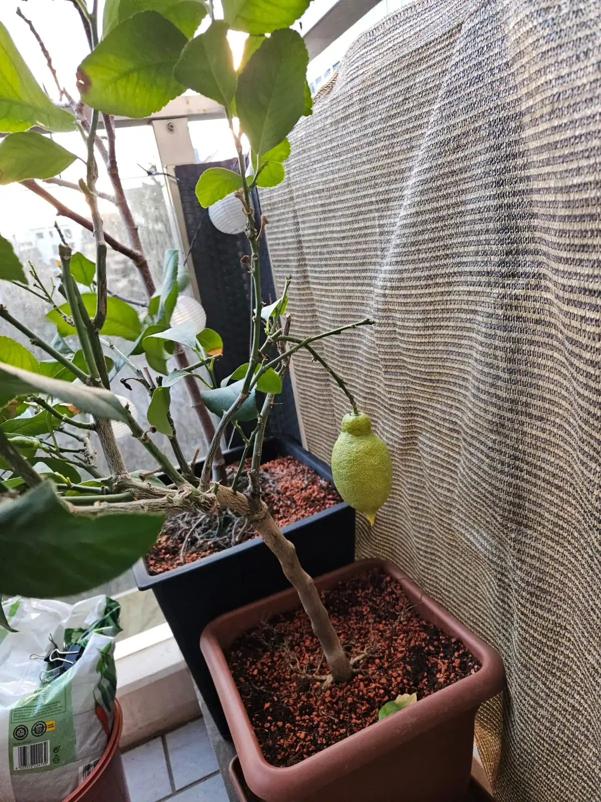 Der Zitronenbaum, den ich vor 3 Jahren noch abenteuerlich eingepackt habe für den Winter... lebt noch. Und er ist seitdem durchweg draußen geblieben, mittlerweile nur mit einem Überwurf bei extremer Kälte, wie wir sie dieses Jahr hatten...