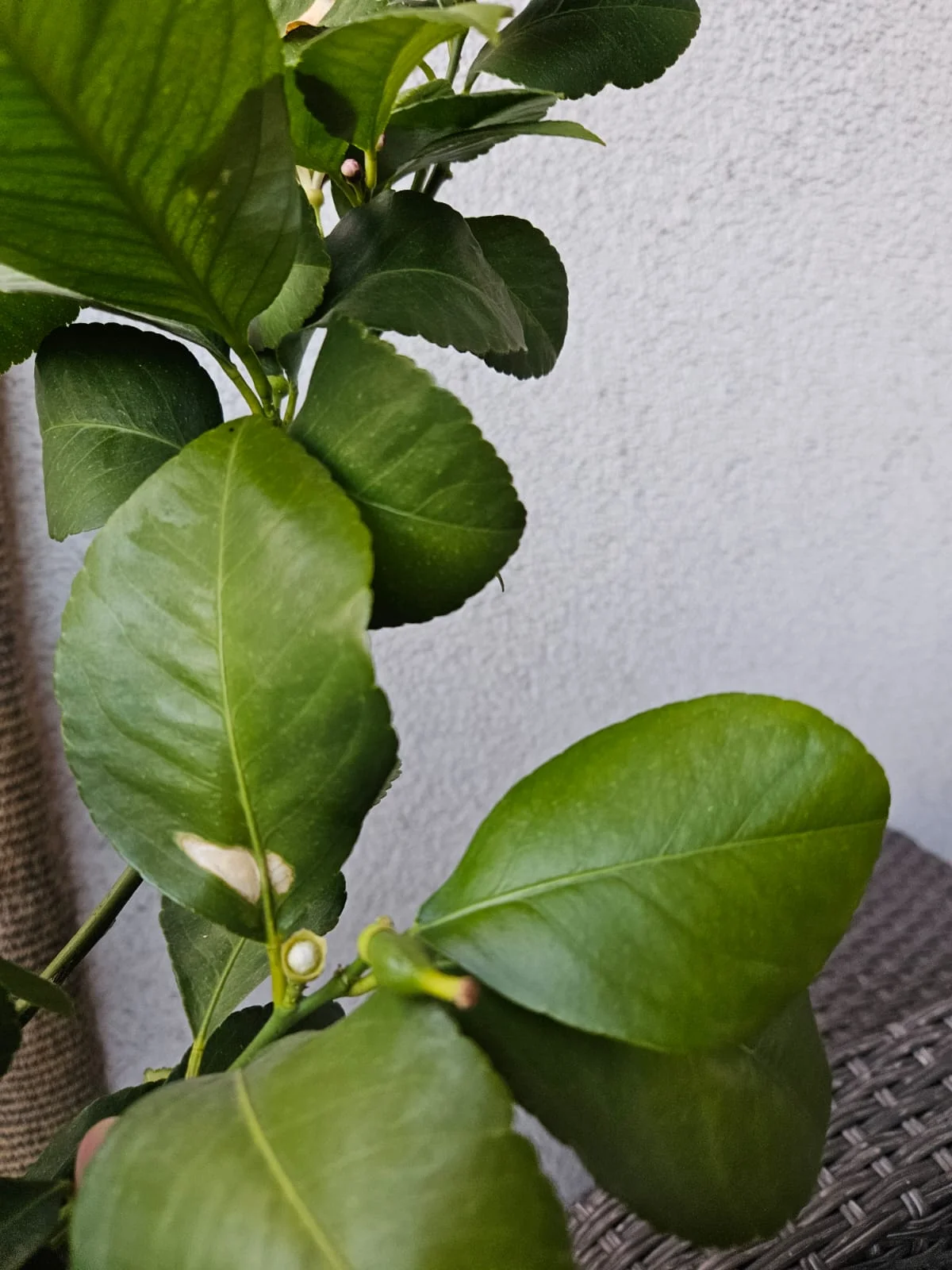 Bis auf ein paar Blattschäden an den äußersten Blättern soweit alles ok, jedes Jahr mit ein paar Früchten und vielen Blüten (von denen leider viele braun werden und abfallen).