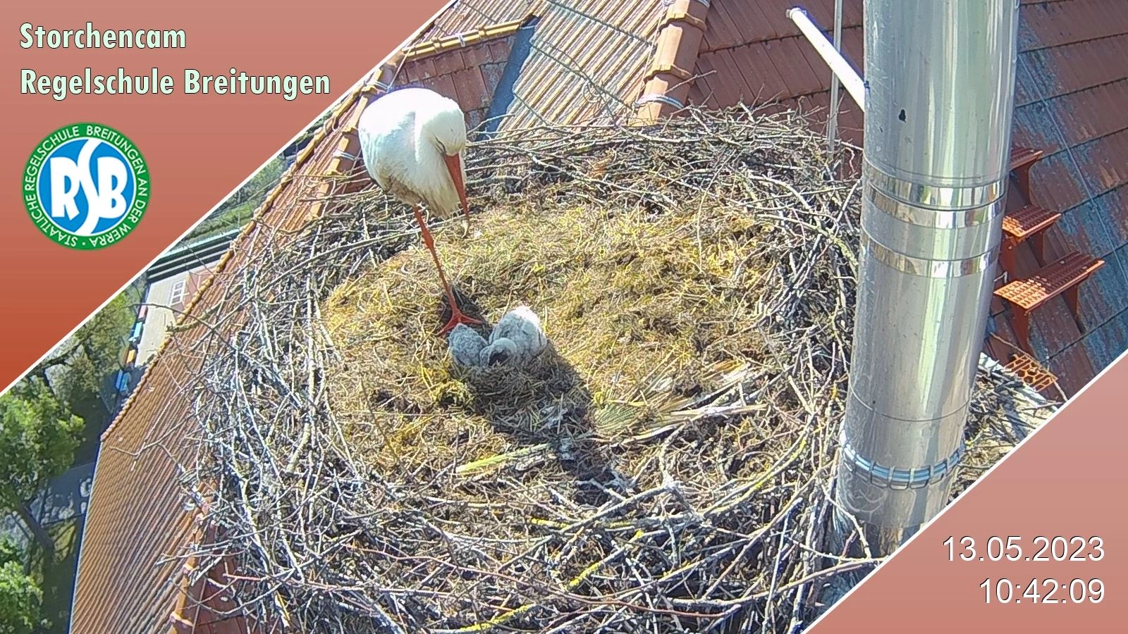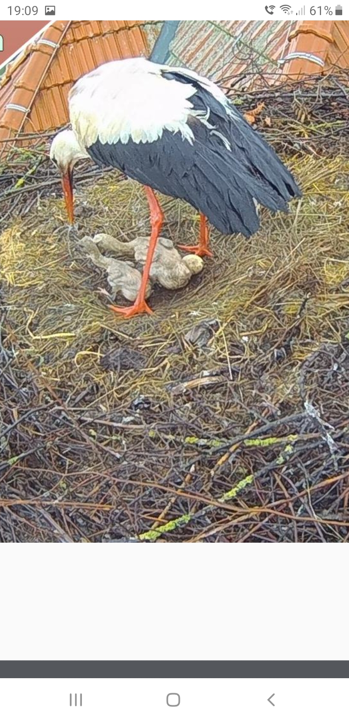 • Vater Storch hat Grünzeug mitbegracht, mit dem ganzen Wedel im Schnabel sprang das Bild zu schnell um, als dass ich ein Foto von speichern konnte.