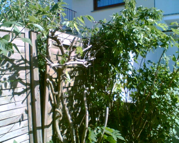 Und nun zu den traurigen Nachrichten, die mich gestern dann doch geschockt haben. Ich habe ja berichtet, dass das letzte Gewitter bei uns keinen großen Schaden angerichtet hat. Aber das muss ich leider berichtigen. Ich habe nämlich gestern begonnen, den Blauregen, der so komisch in den Garten reinragte und mittlerweile sehr groß geworden war, wegzuschneiden und nun weiß ich auch, warum er so komisch in den Garten reinragte. Im letzten Gewitter hat er dem Wind wohl nicht ganz standgehalten, hat den Zaun, an dem er Stand an einer Stelle aus der Verankerung gerissen und stand deshalb so komisch da. Also nahm ich die Astschere und los ging es. Denn so bleiben konnte es nicht. Beim nächsten Gewitter wäre vielleicht schlimmeres geschehen. Naja, und so sieht es nun aus: