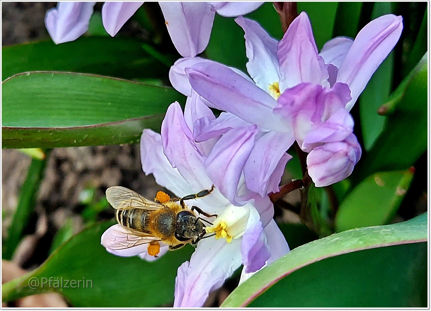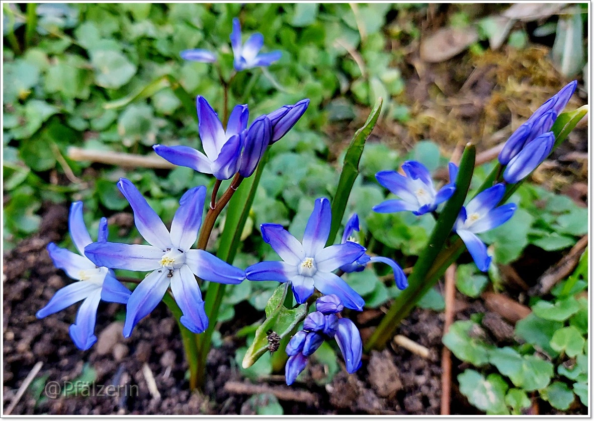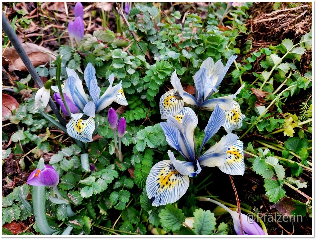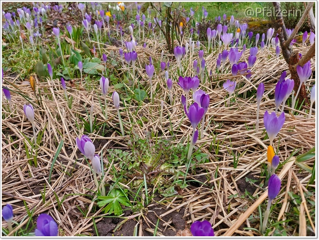 Weil keine Sonne schien, blieben die Blüten der Elfenkrokusse geschlossen. Vorne auf dem Bild seht ihr eine prächtige Löwenzahn-Rosette. Sie darf wachsen, weil ich die jungen Blätter für einen Wildkräutersalat verwenden möchte.