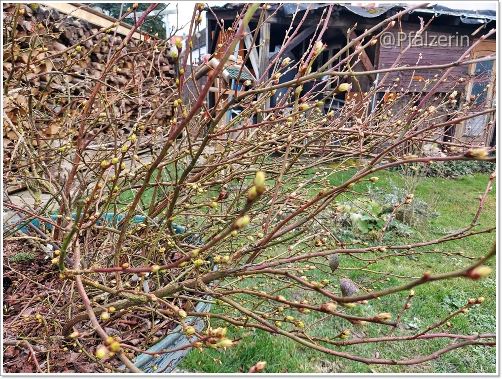 Bei den Kulturheidelbeeren zeigt sich auch schon Leben. Sie haben dicke, grüne Knospen bekommen. Allerdings ernten wir so gut wie keine Früchte, denn die Amseln sind immer schneller und fressen die Heidelbeeren auf, ehe sie reif sind.