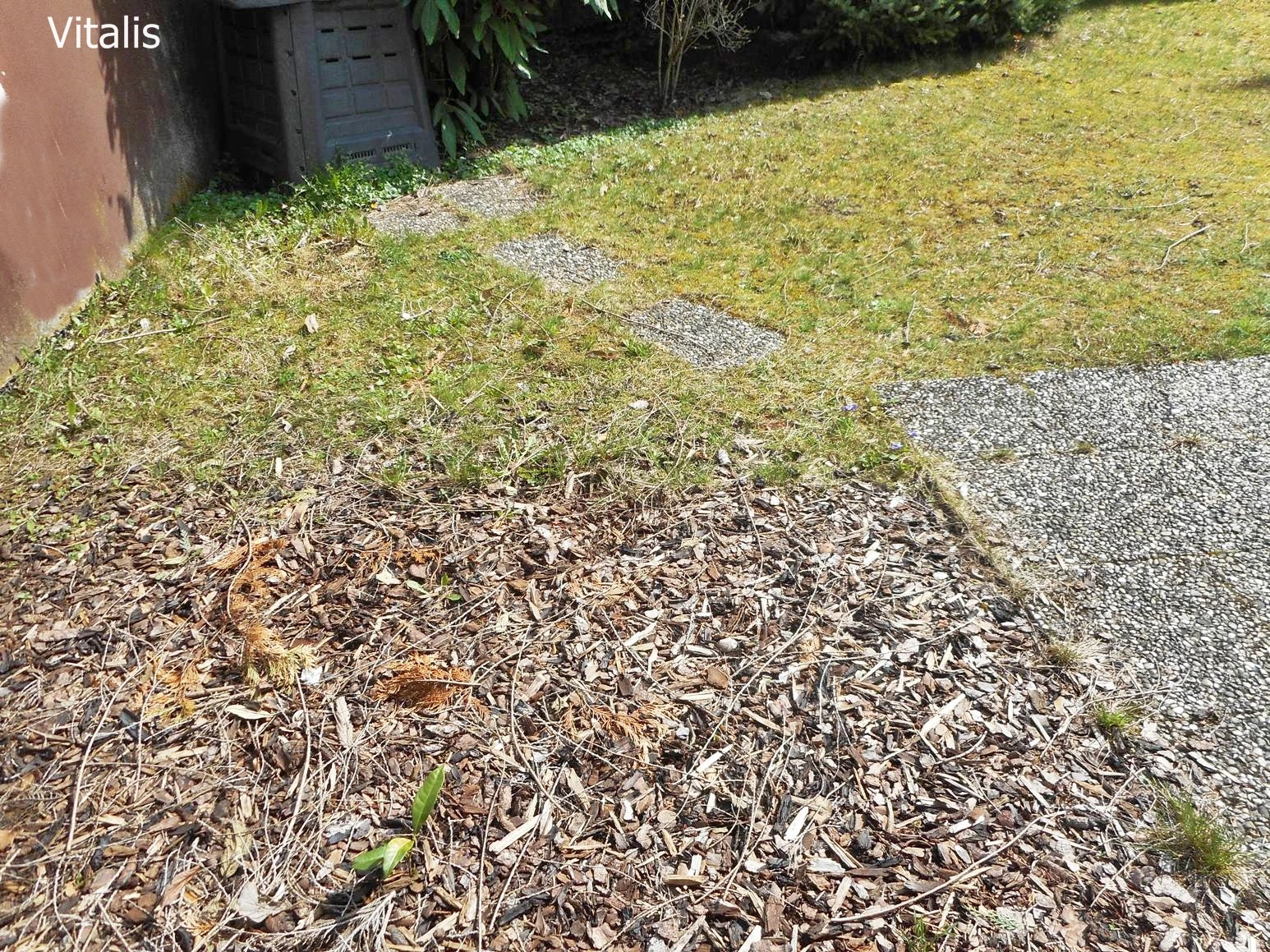 Gestern habe ich eine Aufnahme von der Terrasse aus gemacht. Man blickt auf viel Grün, weil auch in den Gärten rundum viele Bäume und Sträucher wachsen. Sie verdecken auch das Mehrfamilienhaus ganz unten am Berg.