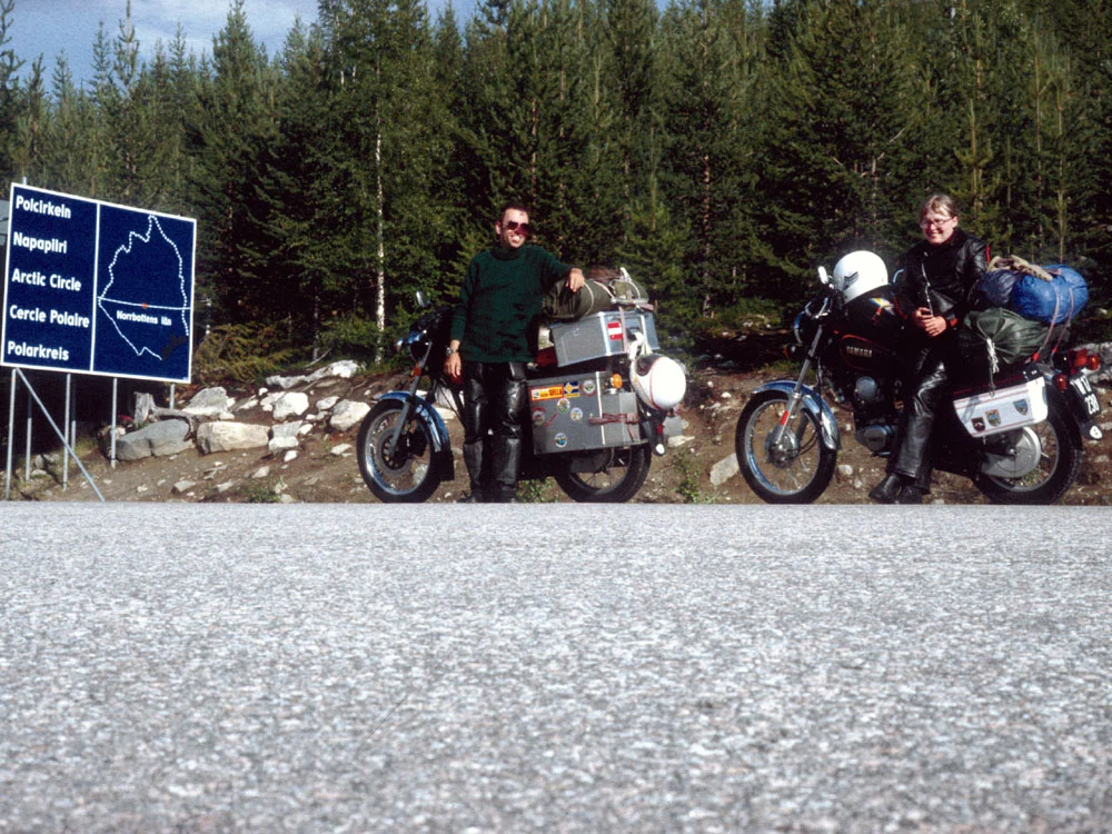 1982 durch Schweden war meine erste große Reise mit dem eigenen Motorrad. Ich hatte zwei Jahre zuvor den Führerschein gemacht, nach einer Reise auf dem Soziussitz hinter meinem Mann, das fand ich sehr unbequem, mitnehmen kann man so auch herzlich wenig und selbst Motorradfahren wollte ich ohnehin. Im nächsten Jahr habe ich in Südtirol fahren geübt und dann ging es nach Schweden, weil eine Kollegin meines Mannes davon schwärmte, wie toll das Licht im Norden wäre. Das Ziel war den Polarkreis zu erreichen und die Reise bestand hauptsächlich aus Fahren. Wir hatten einen winzigen Reiseführer mit Routenvorschlägen und ein paar Hinweisen auf Sehenswürdigkeiten, die Beschreibungen waren teils ungenau, und es gab nur minimal Tafeln, die auf Sehenswürdigkeiten hinwiesen. Wir fuhren mal eine Weile hin und her um eine besondere Kirche zu suchen und fanden sie nicht.