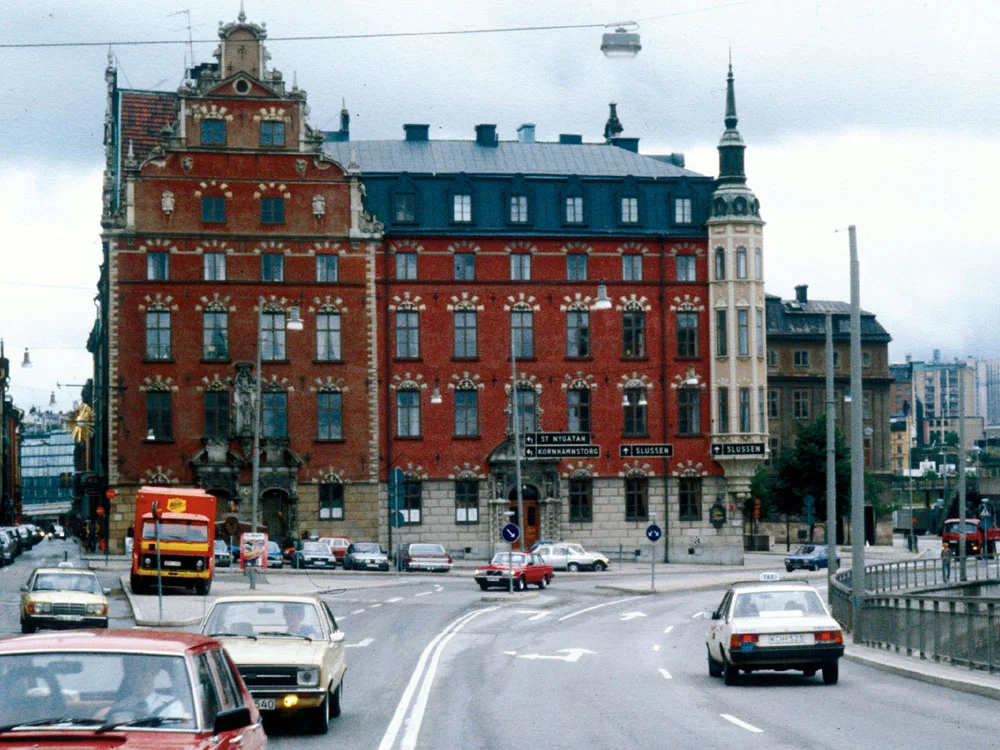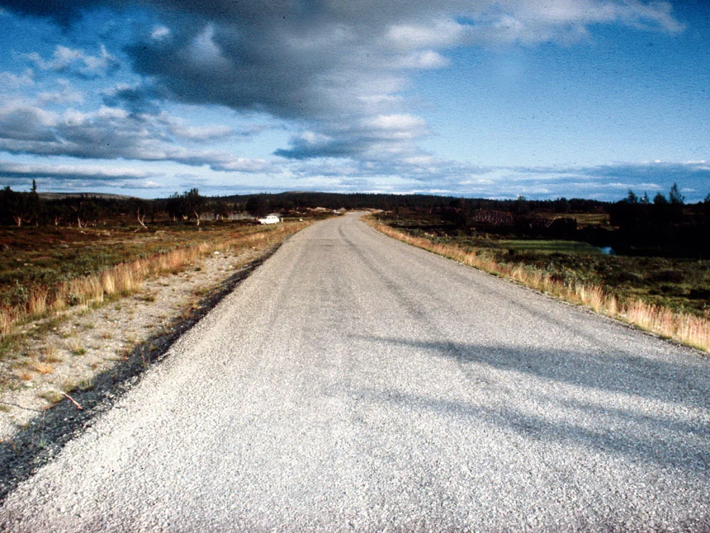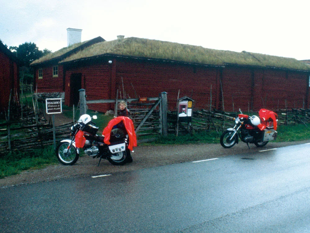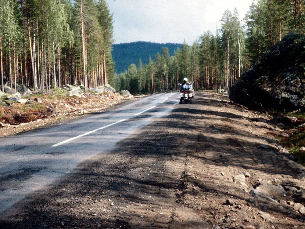Es war August, es war anfangs heiß, ich bin ohne Handschuhe gefahren und habe eine „Sonnenallergie“ auf den Händen entwickelt. Es ging recht gemütlich zu auf Schwedens Straßen (unsere Einzylinder-Motorräder waren dafür auch gerade richtig), ein Teil unserer Strecke führte durch eine einsame Gegend mit Schotterstraße, und es war damals ein wirklich ordentliches, sauberes und friedliches Land. Die Autofahrer hielten sich an die erlaubte Höchstgeschwindigkeit, im Norden lagen die Postpakete neben der Hauptverkehrsstraße, von wo die etwas davon entfernt lebenden Menschen sie holten, und als mein Mann mal seinen Zündschlüssel stecken ließ, wurde er von einem Schweden freundlich darauf aufmerksam gemacht. Was wir an Geld auf der Reise brauchten, hatten wir in Schillingscheinen mit, die in Schweden gewechselt wurden, es gab schon ein paar schöne Campingplätze, aber ich erinnere mich auch an einen, auf dem ich mich überhaupt nicht wohlgefühlt hatte, da war nur eine Wiese, ein Klo, ein Wasserhahn, ich weiß nicht, wie wir da hin geraten sind .. war das wirklich als Campingplatz ausgewiesen? Auf meinem Motorrad waren Zelt und Schlafsäcke festgezurrt, in den Kisten auf dem meines Mannes hatte neben dem, was man so braucht auf einer Reise, ein Fotoapparat und ein paar Filme Platz gefunden .. es wurden schöne Dias, doch als sie eingescannt wurden, waren sie nicht mehr so schön. Ich bitte die bescheidene Qualität zu entschuldigen.