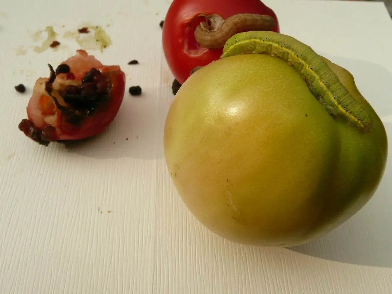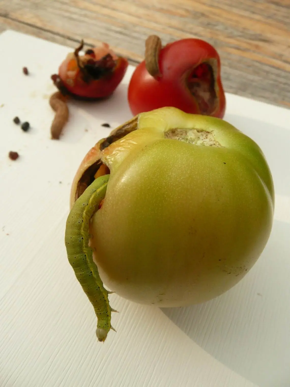 Obwohl ich schon viele Jahre Tomaten in großen Beständen anbaue, erscheint dieses Jahr in meinem Folienzelt ein neuer, mir bisher unbekannter Schädling! Es sind seit 1 Woche grüne und braune Raupen,etwa 4 bis 5cm lang, die sich in die an der Pflanze hängenden Tomaten hineinfressen und gleichzeitig das Laub nicht verschmähen. So haben sie innerhalb einer Woche große Schäden angerichtet. Wenn ich an einem Tag die Raupen abgesammelt und getötet hatte, sind am nächsten Tag neue da. Nach KOCH: Wir bestimmen Schmetterlinge, ist die grüne wahrscheinlich die Raupe der Zimteule. Eine Invasionseule, die über die Alpen zu uns kommt. Kann sein, dass durch die heißen Wochen sehr viele gekommen sind. Dass sie allerdings die giftigen Nachtschattengewächse frisst, steht in keiner Literatur.