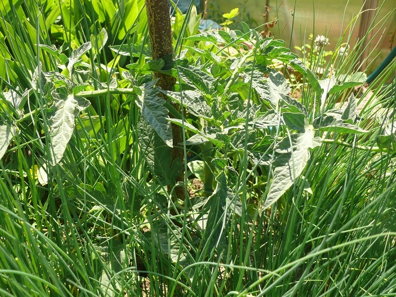 Unten im Bild seht ihr das Kraut der Kartoffeln. Die Tomate steht demnach unmittelbar bei den Kartoffeln. Diese Kartoffelblätter sind noch nicht so stark angegriffen (äußer Rand des Kartoffelbeetes) Im Innern des Bet liegt das KRaut zu dem Zeitpunkt schon am Boden.