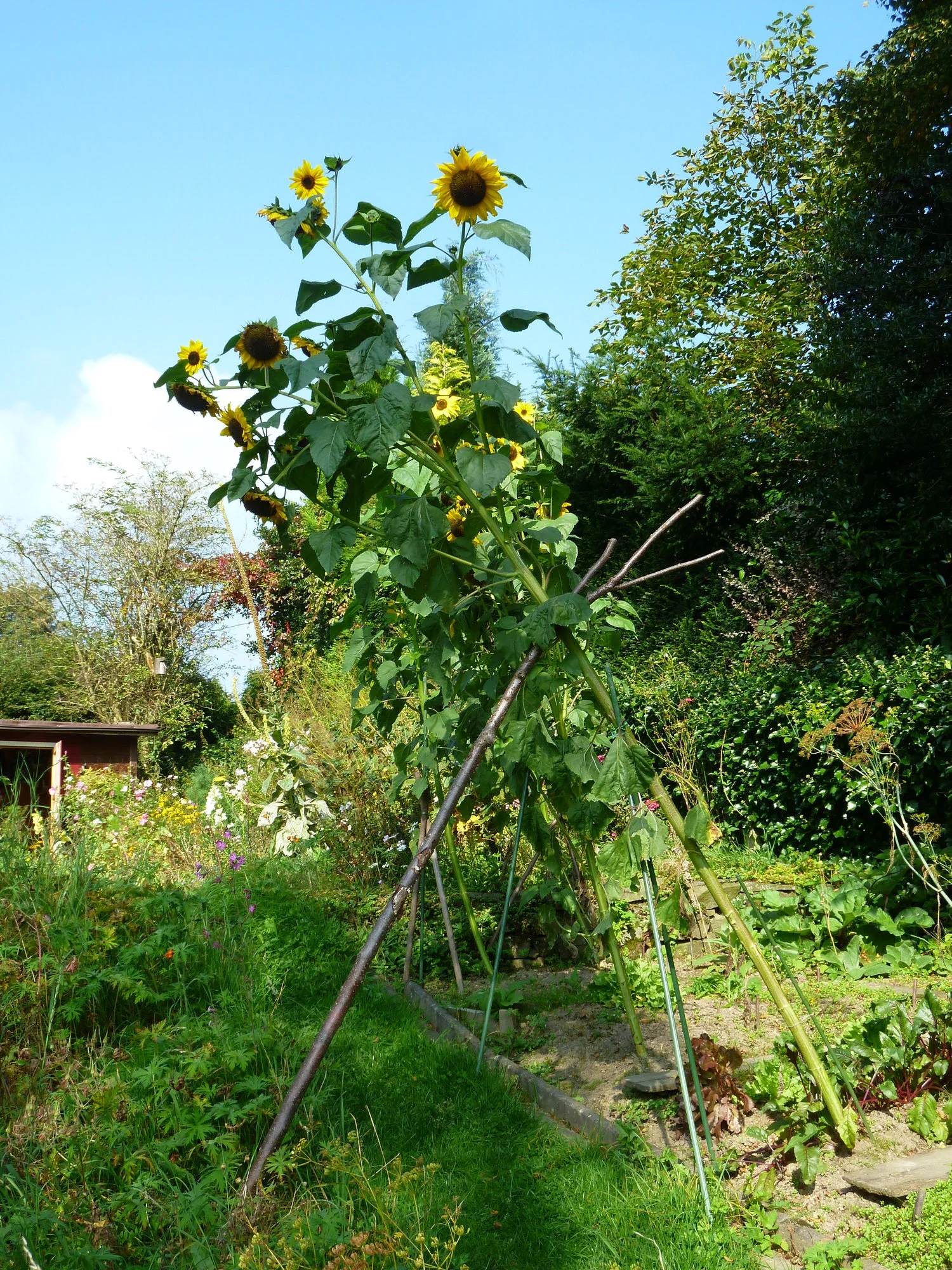 Auf dem Beet steht mein Vater also lachend mit nach oben gereckten Armen auf dem Hochbeet und die Sonnenblumen sind ungefähr doppelt so hoch wie er.