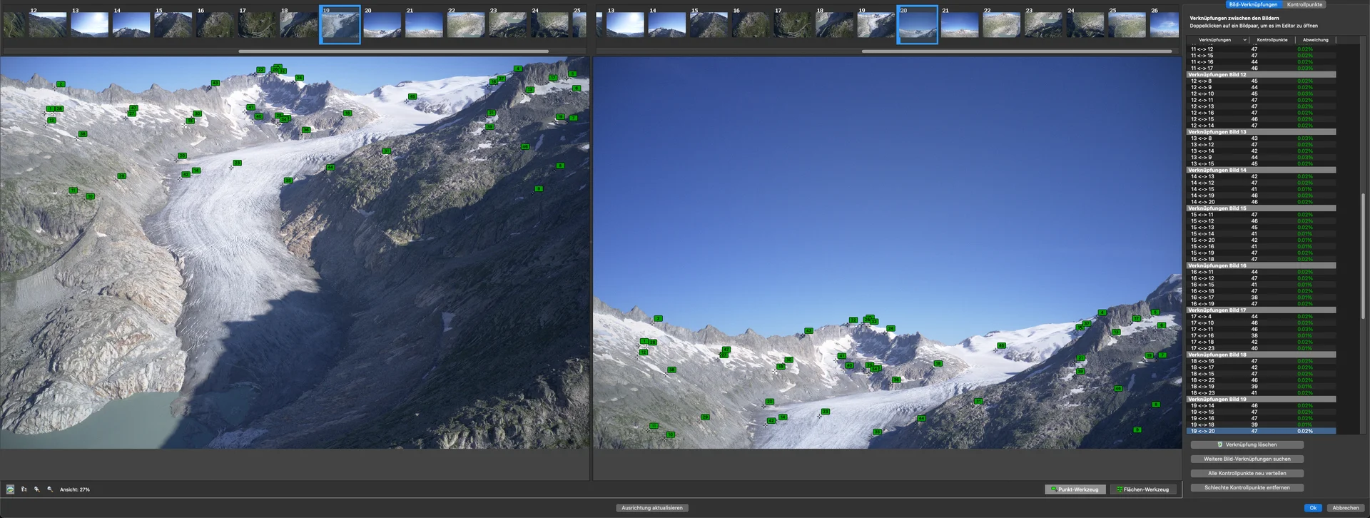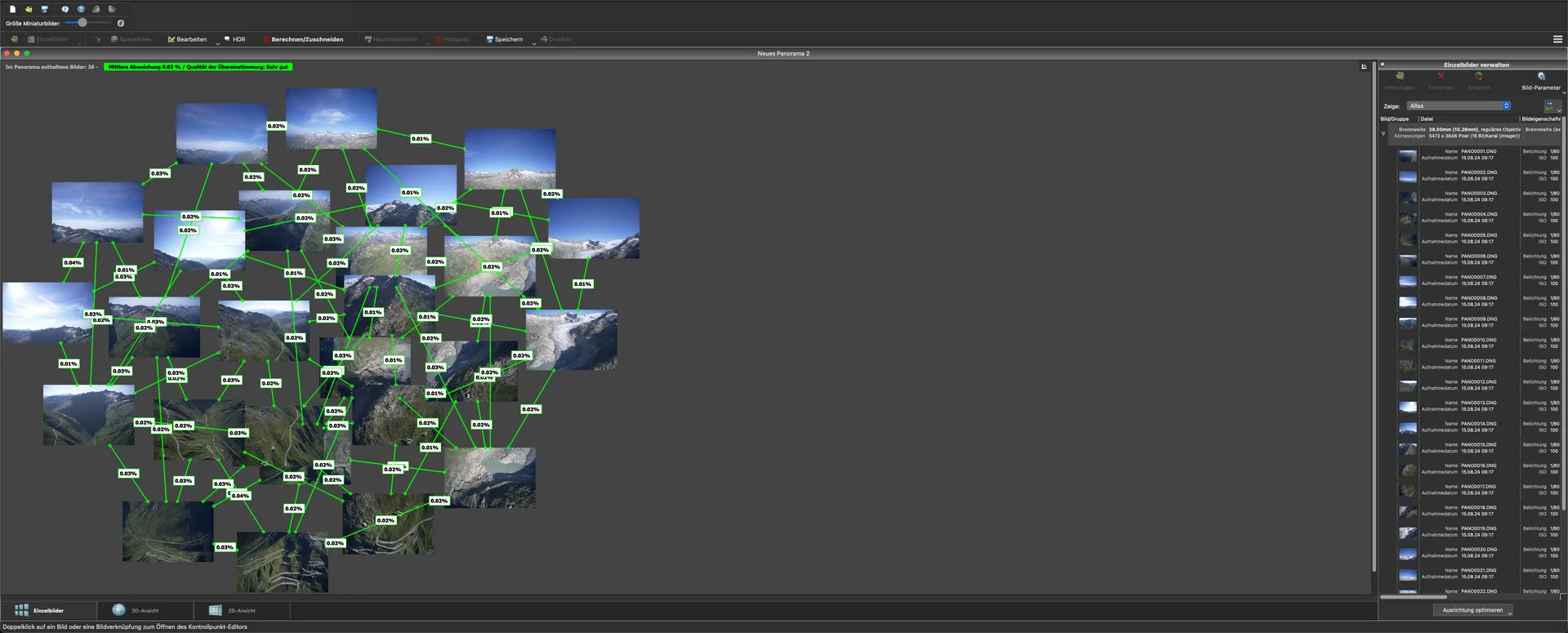 Und ein weiterer sehr wichtiger Arbeitsschritt danach, der darstellt, wie die Kontrollpunkte der einzelenen Bilder im Verhältnis der Abweichungen und Übereinstimmungen für das dann final zu rendernde Panorama zueinander stehen.