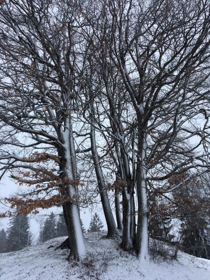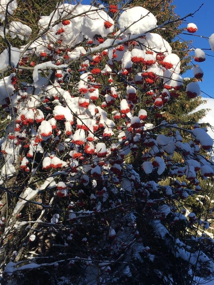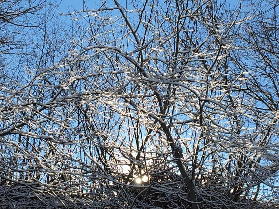 . Deshalb stehen die ja da, damit ich im Winter auch Farbe habe. Jetzt wirken die natürlich doppelt schön. Jetzt kommen erst die richtigen Kitschbilder mit blauen Himmel, das wirkt erst schön. Noch ein Bild hinterm Haus am Bach, da steht jetzt täglich stundenlang der Graureiher und wartet auf Fischleins. Von meinem Bett aus sehe ich auf die Kirche und auf die Uhr, weiß also immer was es "geschlagen hat"
