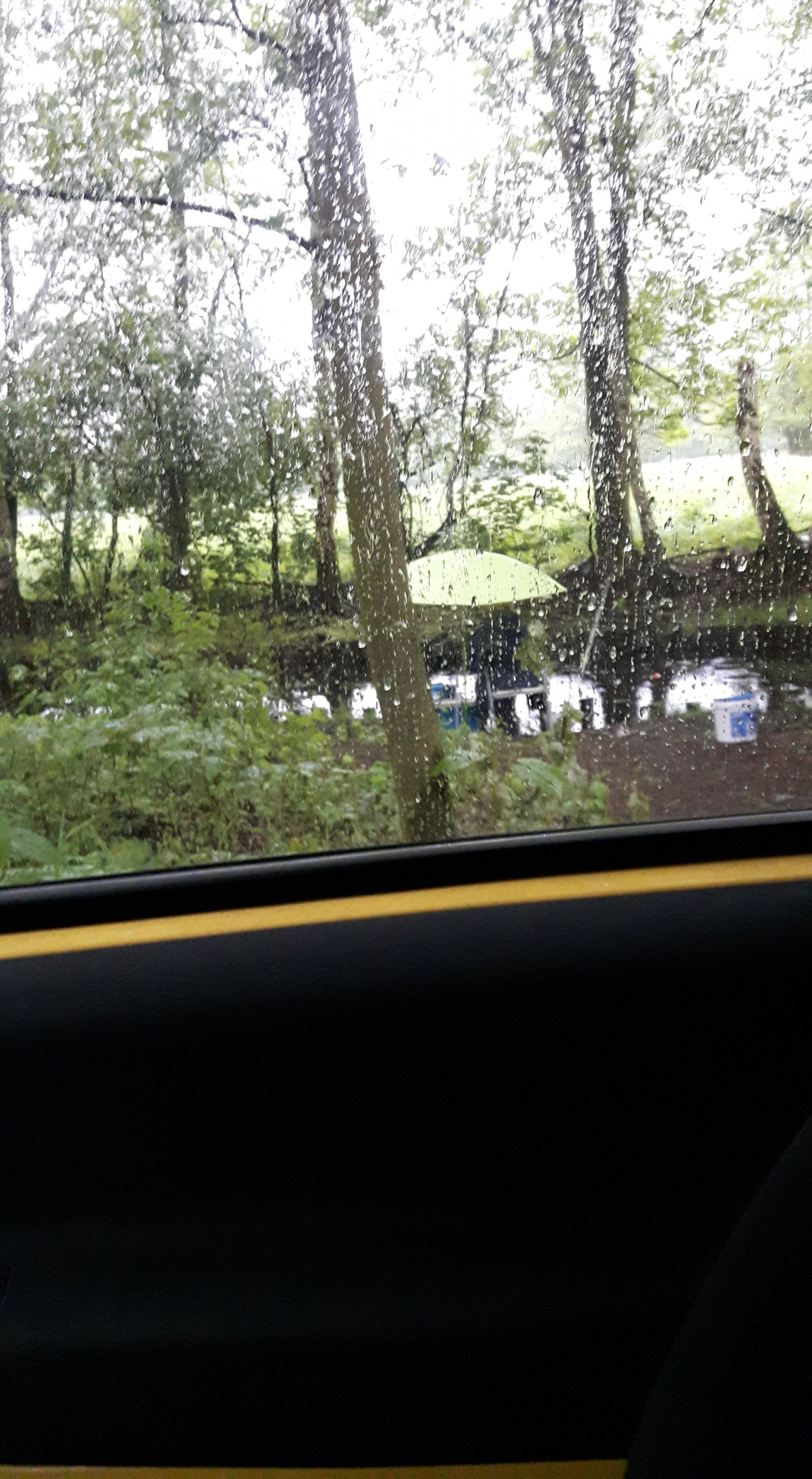 • Durchblick aus dem Auto hinaus zu Muttern, 80 Jahre, beim Angeln im Strömenden Regen.