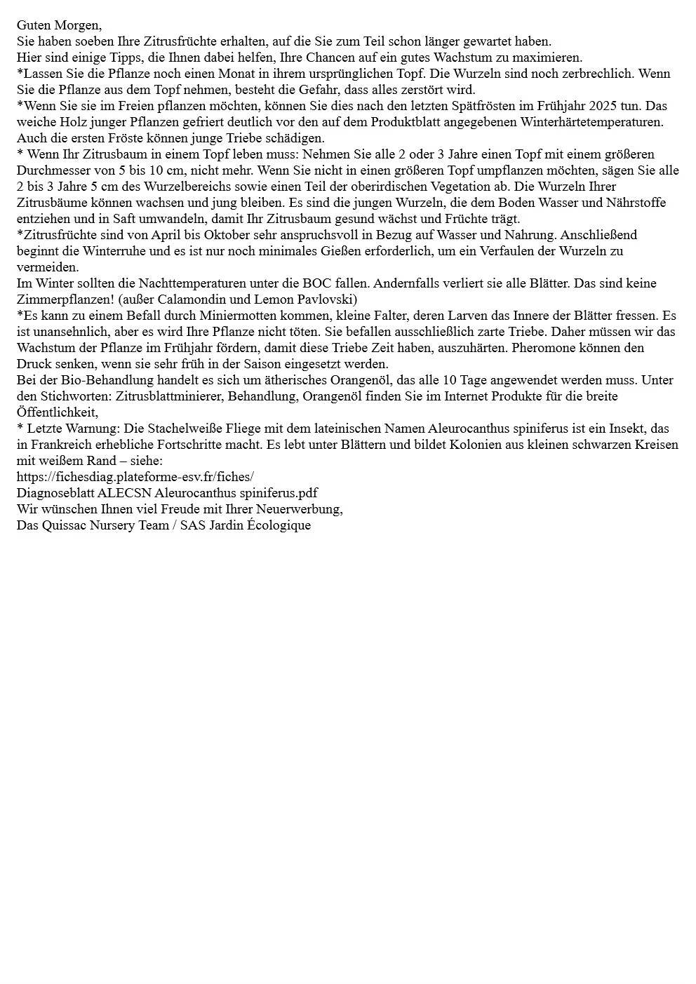 Ich hänge noch eine von der Baumschule beigelegte Pflegeanleitung für Citrus an - im französischen Original und in der deutschen (google-)Übersetzung.