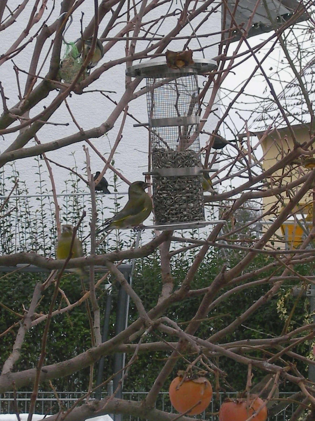 Die Amseln reißen sich um die knochenhart gefrorenen Kakis.