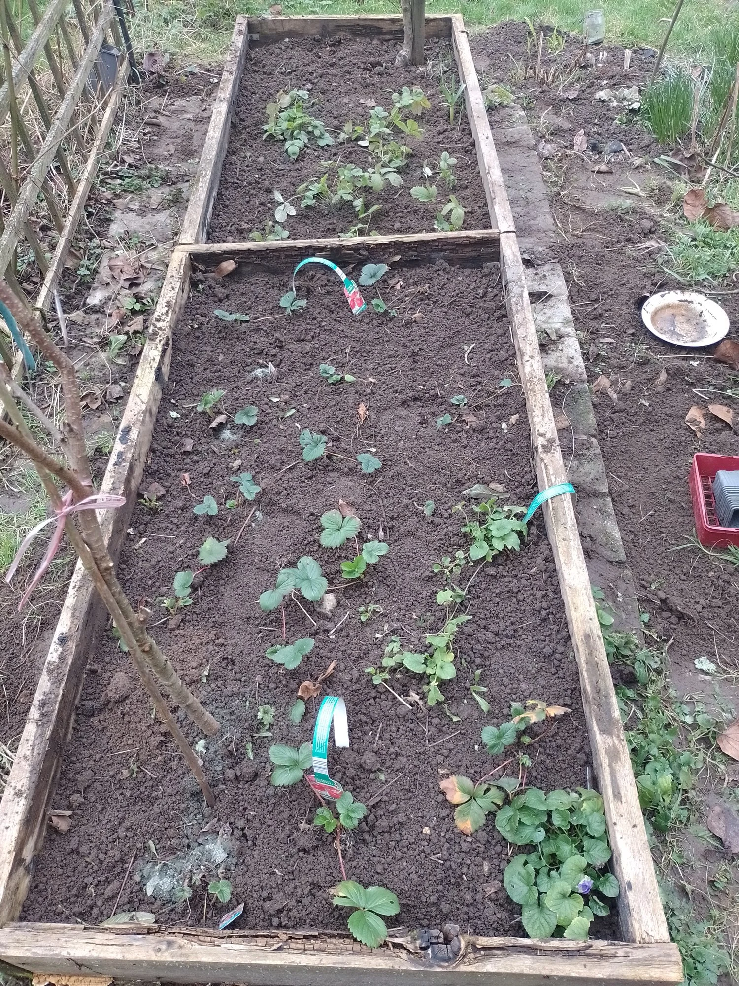 Dann war ich draußen das Erdbeerbert sauber machen, 11 neue Lambada gepflanzt, die hatten im Walipini überwintert.