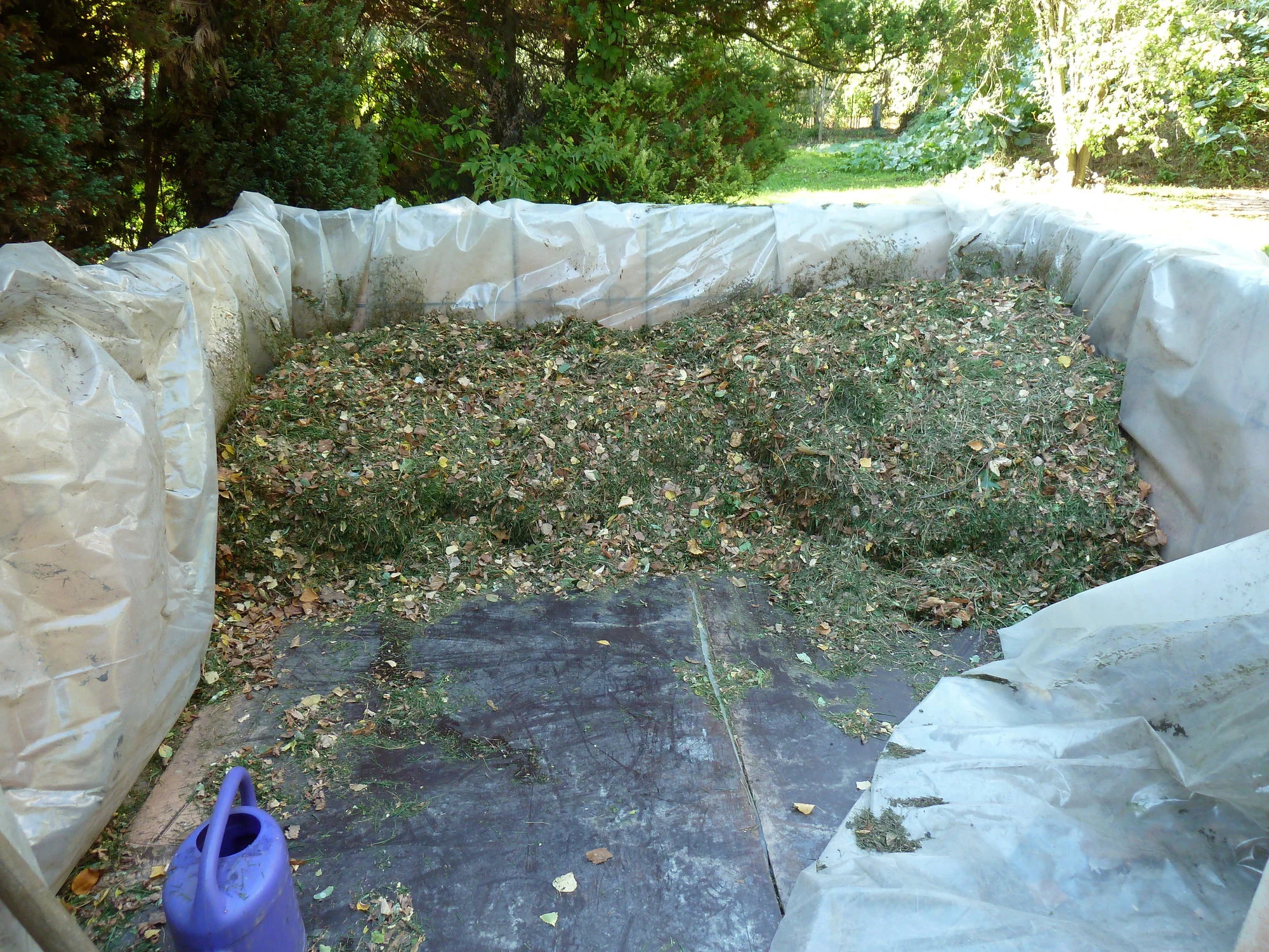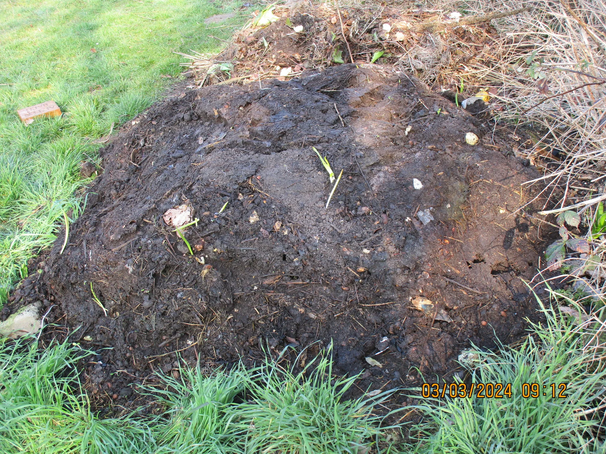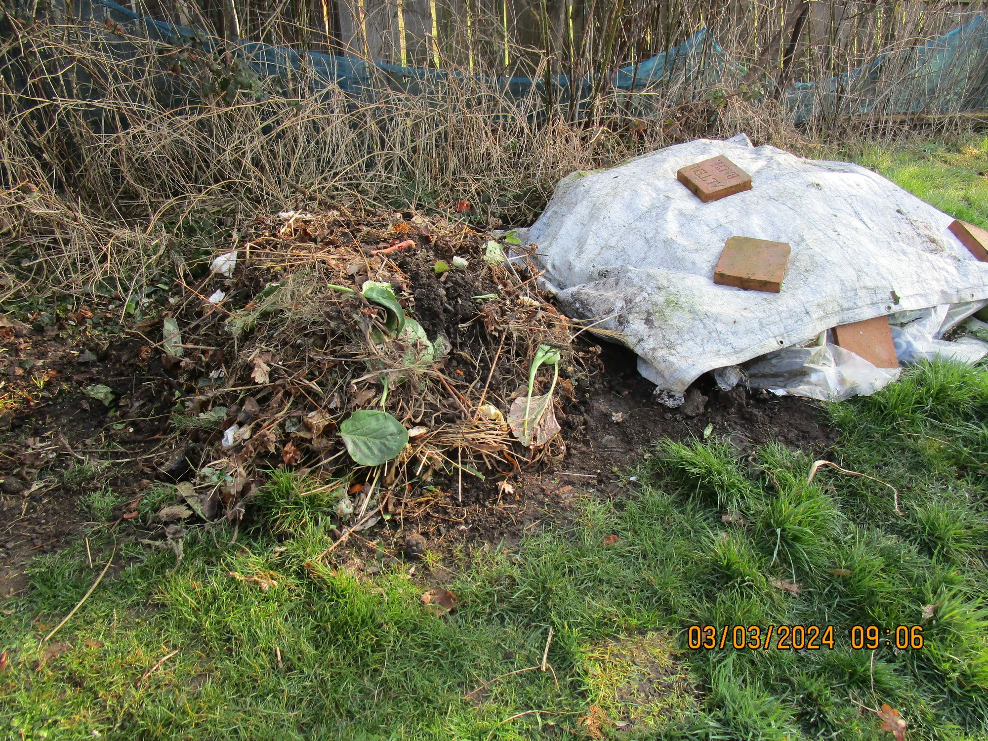 Das ist mein Kompostplatz im Garten. Auf der rechten Seite den komplett abgedeckten Haufen Dieser wird festgetreten und dann komplett abgedeckt und etwa ein drieviertel Jahr nicht mehr geöffnet. Auf diesen Haufen verteile ich zusätzlich EM Lösung und etwas Kompostbeschleuniger .Unter der Folie nutze ich viele Plastesäcke von Nachbarn, die immer wieder Erde im Sack kaufen.
