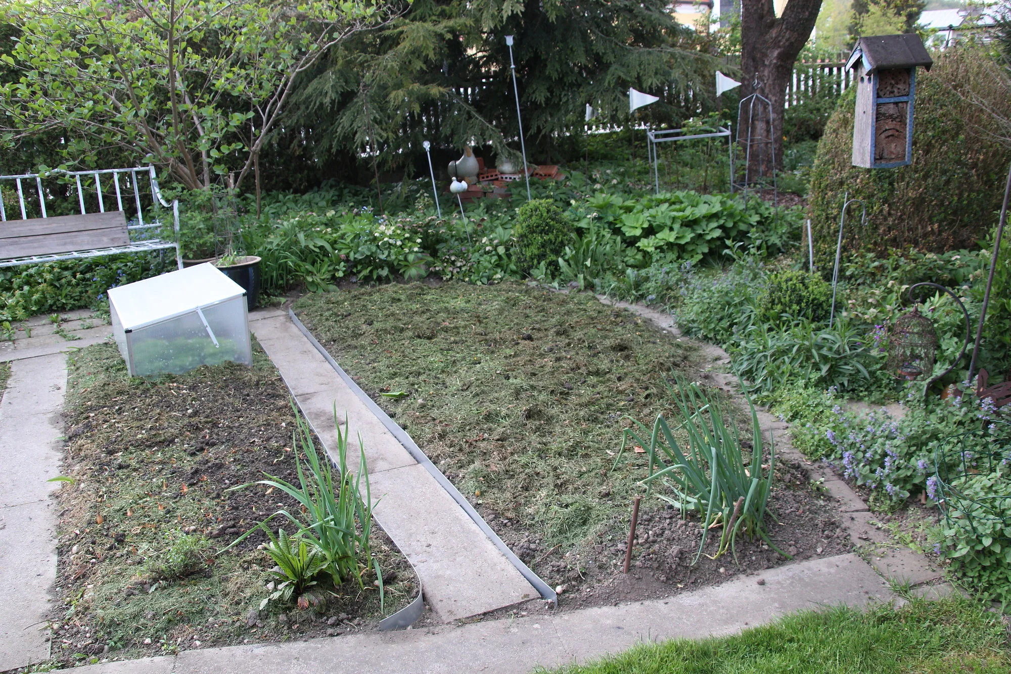 Einen Teil meines Ex-Staudenbeetes entunkrautet und Sommerspiere sowie einen sommerblühenden kleinen Flieder gesetzt, Rose und Zierlauch mussten wandern, ebenso der Wasserdost.