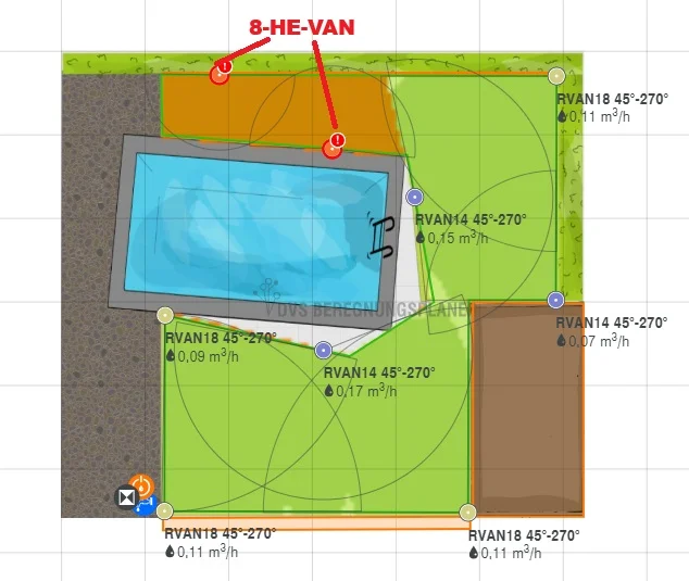 Alle Flächen auf deinem Plan mit 6 Regnern zu bewässern, halte ich nicht für fachmännisch sondern geplant nach der Devise „Hauptsache alles Nass“