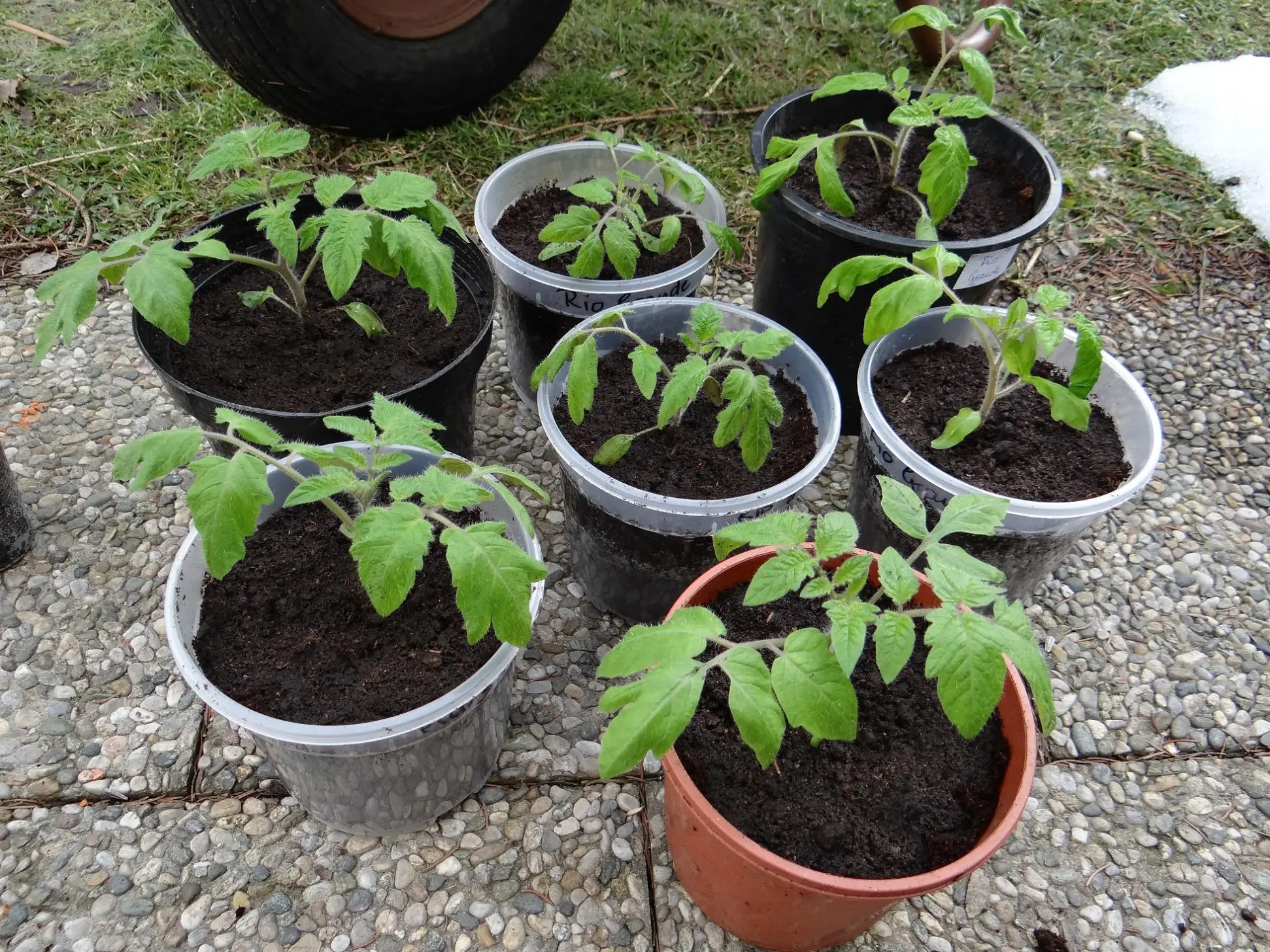 Am 6. März wanderten erste Tomaten aus 0,5 l Becher in kleine Töpfe.