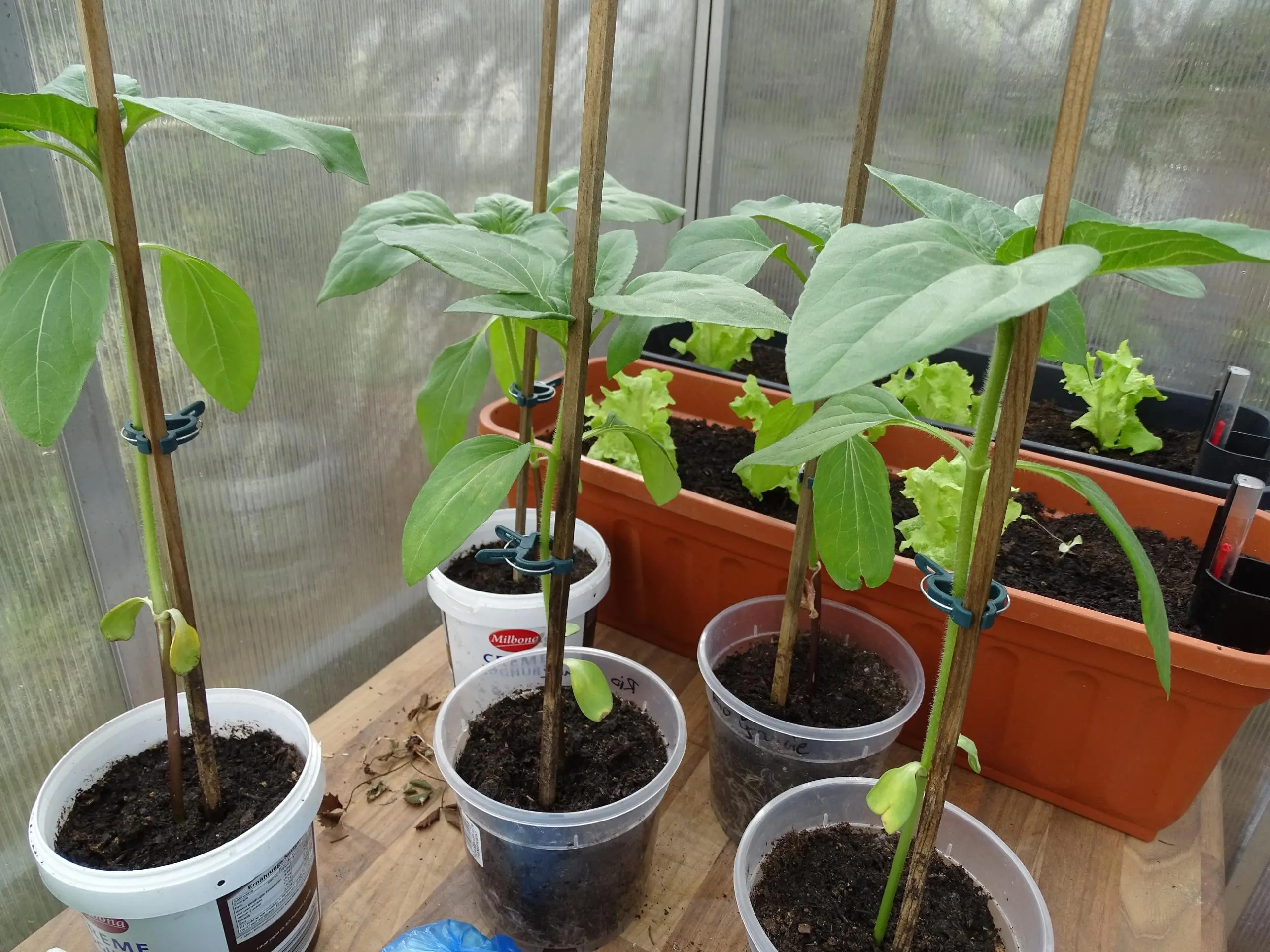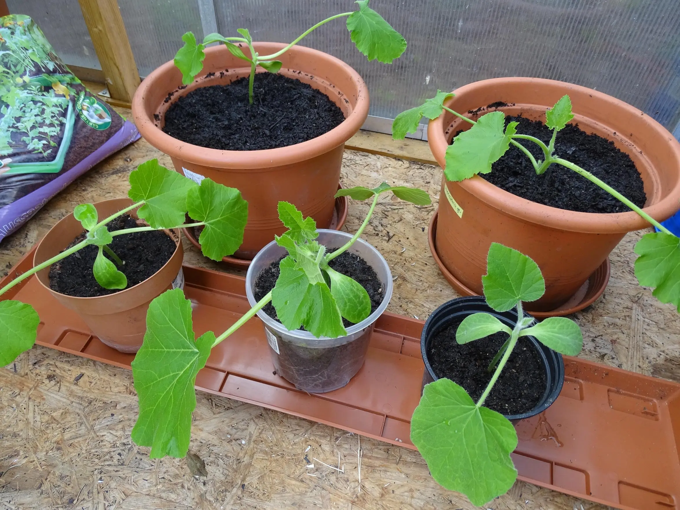Die ersten Zucchinis stehen in größeren Töpfen im Gewächshaus. Davor drei Kürbisse.
