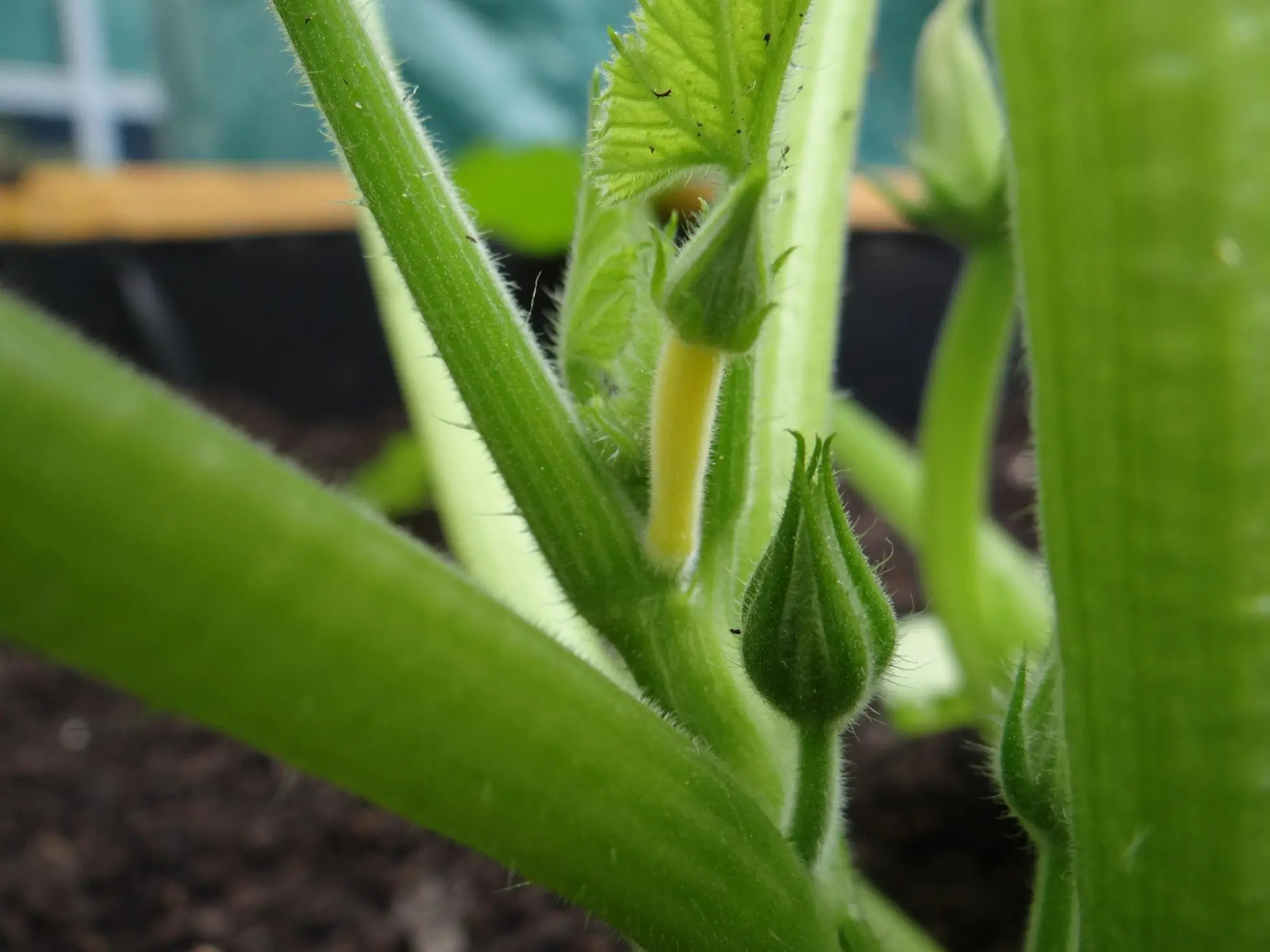 Das erste Gürkchen blüht und eine männliche Zucchini auch
