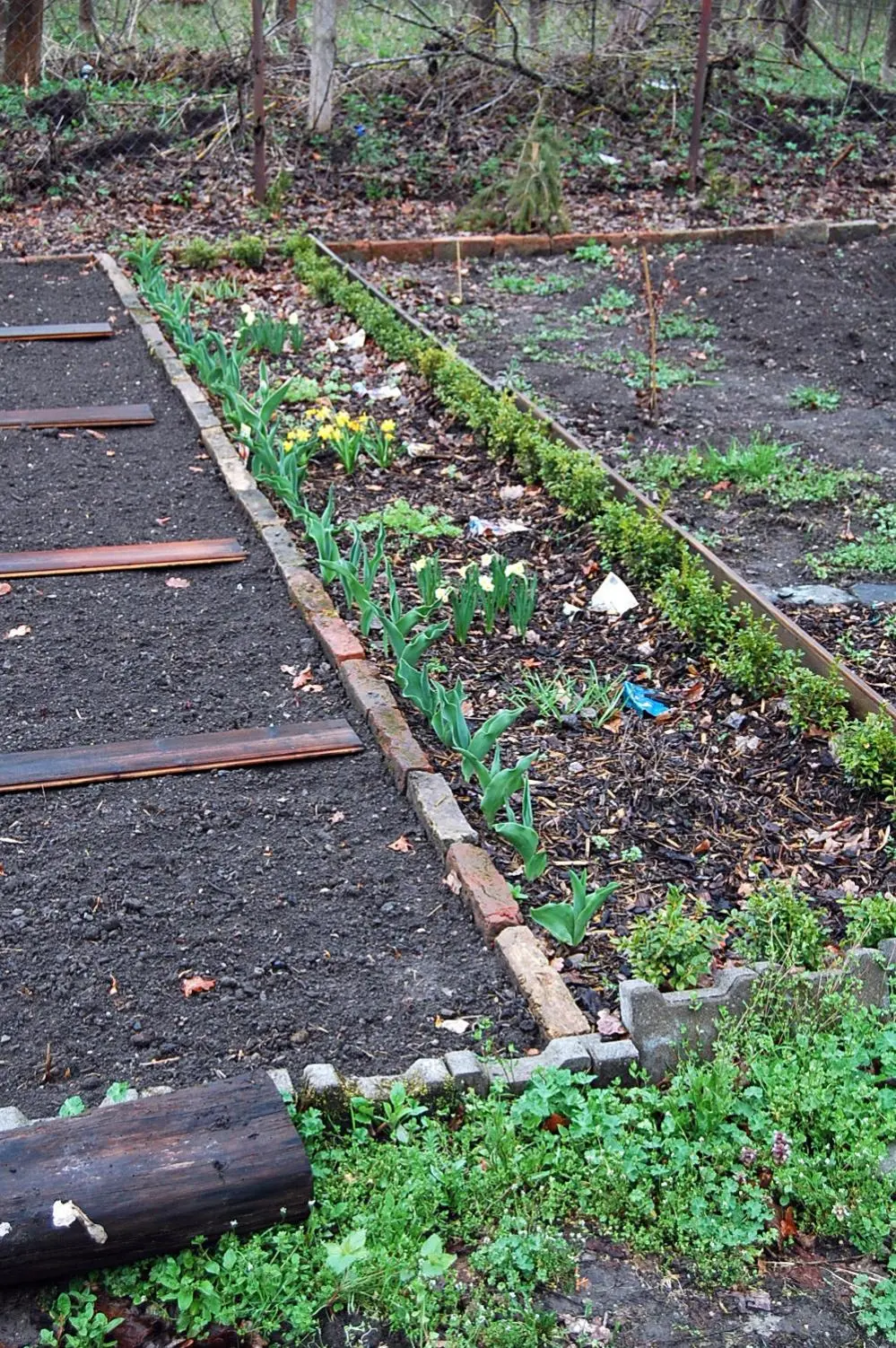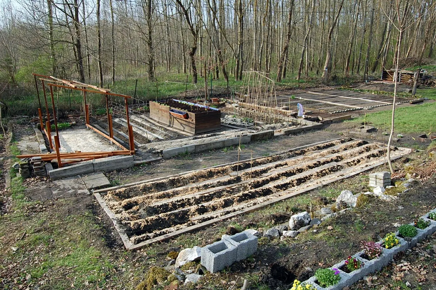 Sauerampfer steht im Blatt, Himbeeren grünen, Winterheckzwiebel stehen, Melisse und Schnittlauch kommt ans Tageslicht, Der Unterbau vom neuen Kalthaus steht.....