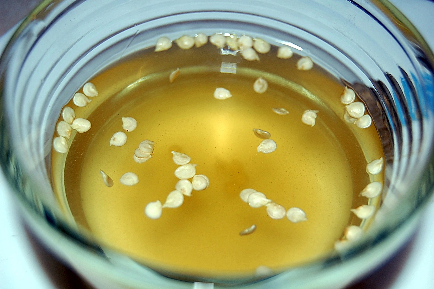 Die Samen liegen jetz für ca. 1h (wenn komplett durchgetrocknet eine ganze Nacht) in einer Lösung aus abgekochtem Wasser und einem Beutel Kamillentee.
