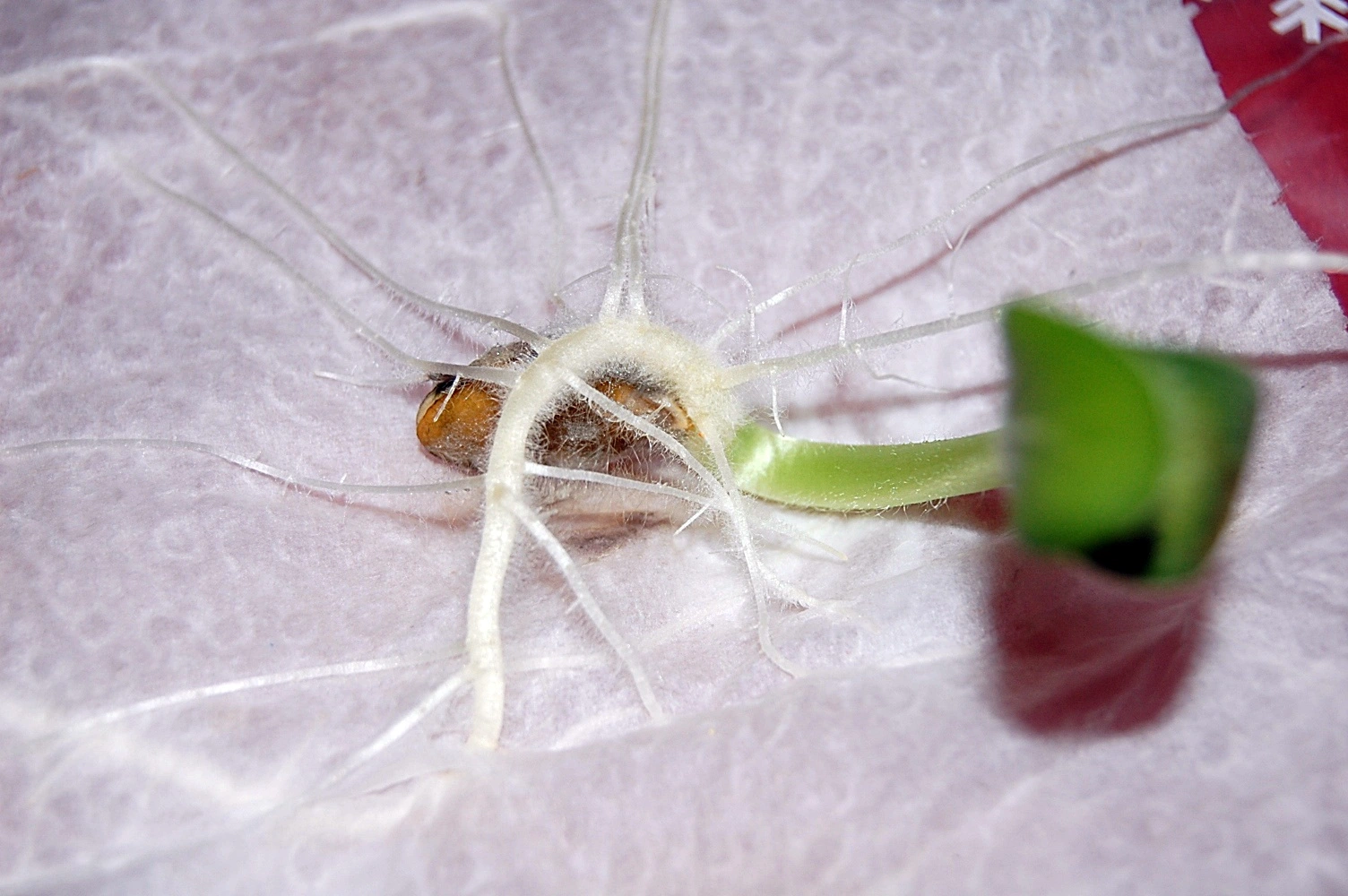 Dazu ein Zewa, 5 Samen reingelegt und eingeschlagen, gut angefeuchtet und in einem Gefrierbeutel gepackt und eingeschlagen.