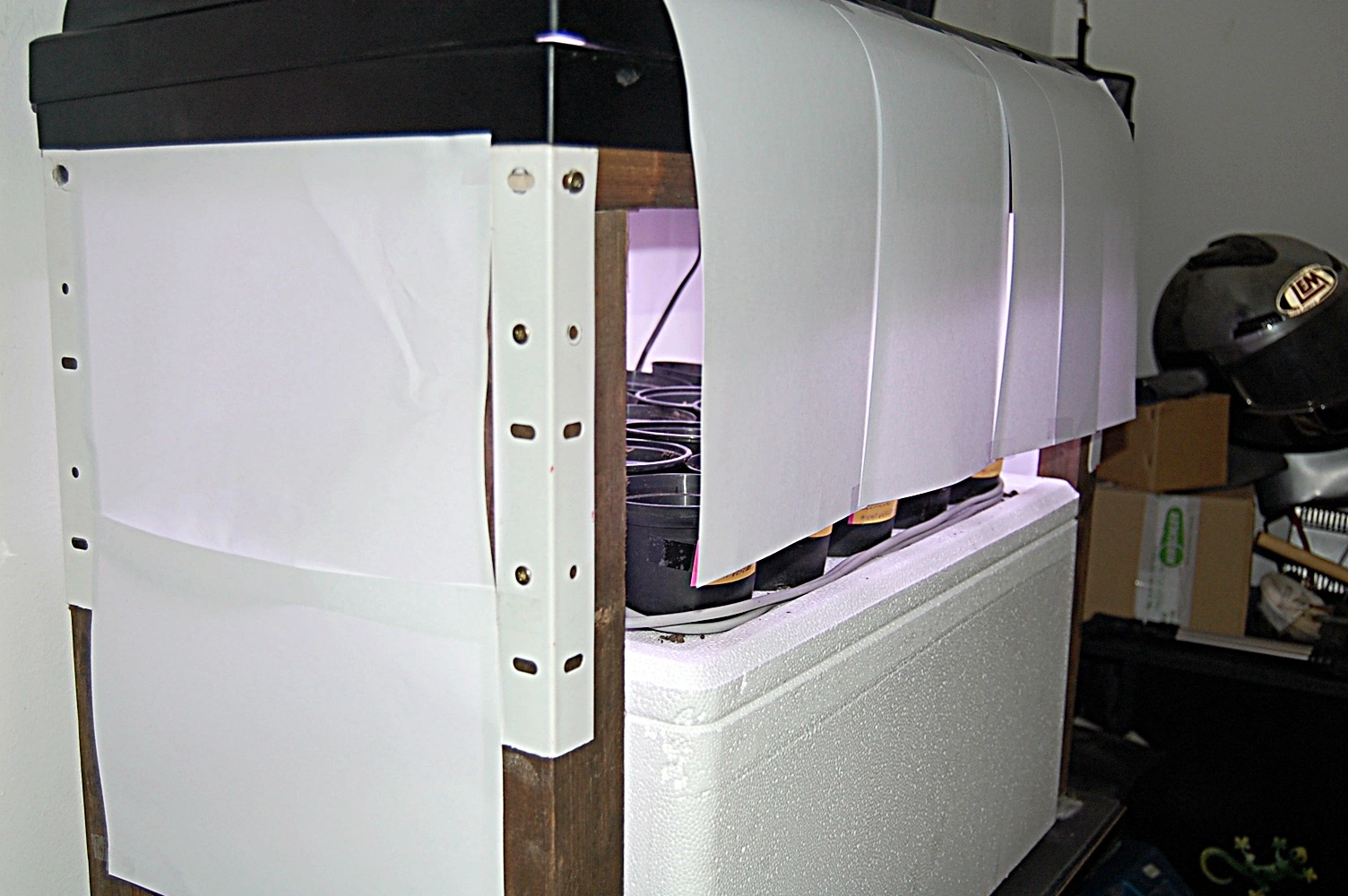 Ich konnt meine Fingerchen und Füße auch nicht still halten und hab vom Keller die 80cm Aquarienabdeckung hoch geholt. 2 neue Power Glow Röhren gekauft, aus Holzbälkchen nen Gestell zusammen geschraubt und Seiten und Front mit Druckerpapier und Tesa verkleidet, eine Styroporbox dient als Erhöhung. Die Abdeckhaube hat intergrierte Reflektoren.
