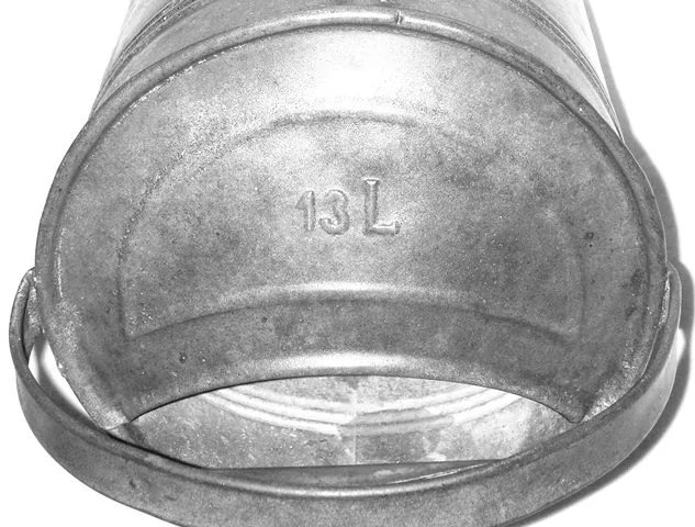 Korpus rund, verzinkt, Höhe 30 cm, Durchmesser 26 cm, Gesamthöhe 43 cm, ohne Literangabe, 1 Sicke, Längsbügel: Band, Handgriff: Band, Spreite: Rohr, Bandeisenfuß
