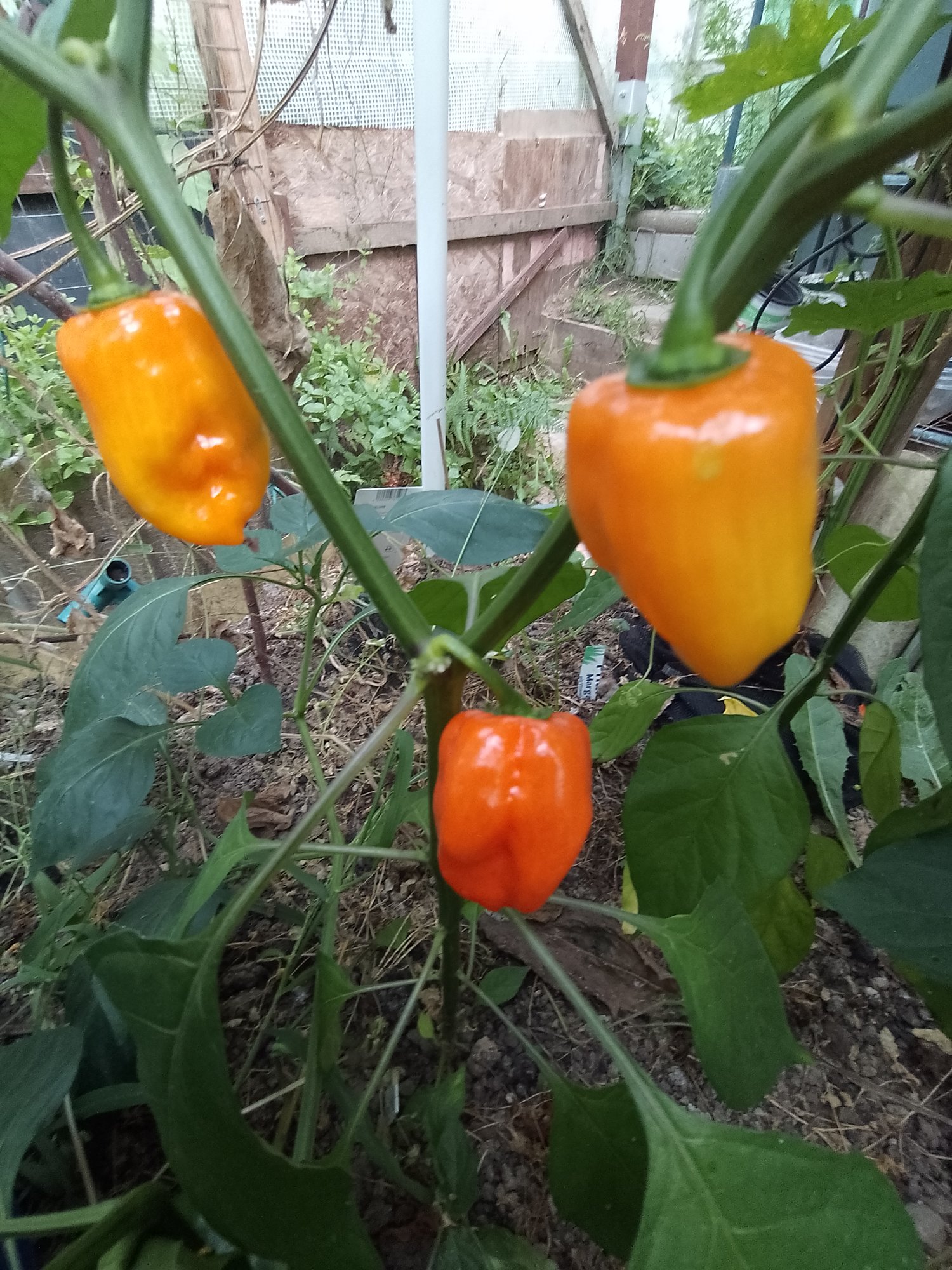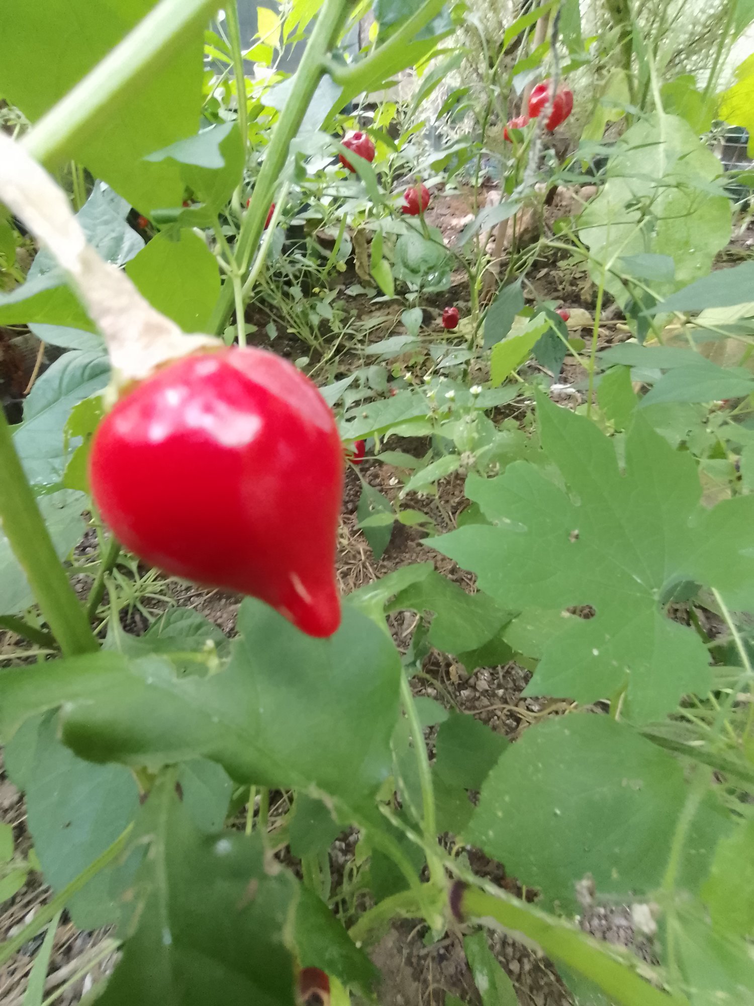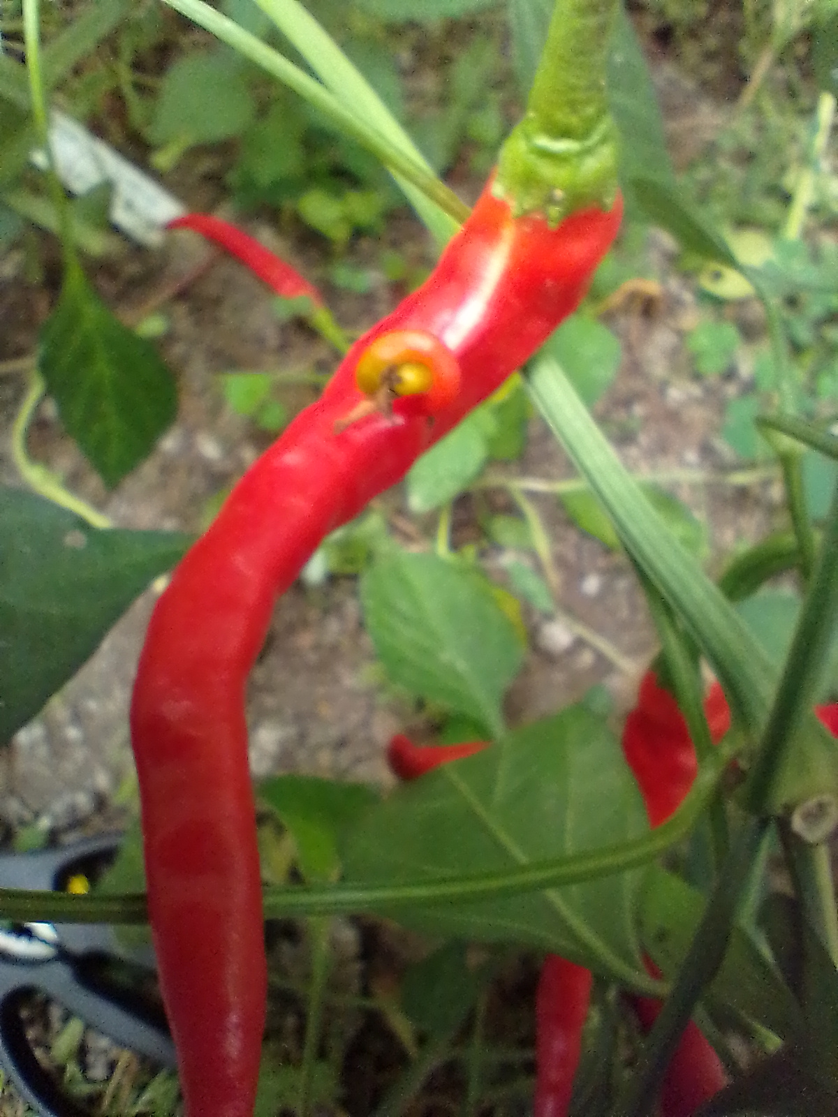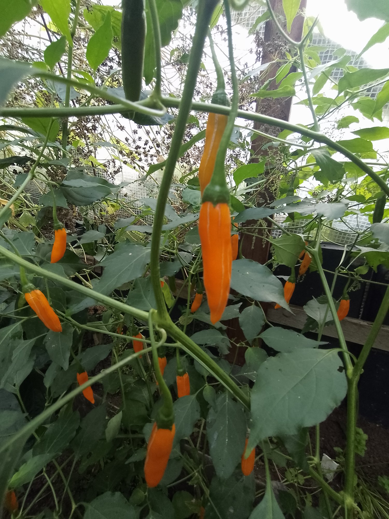 Chili Gorria ,aus dem das Piment de Esplette Gewürz gemacht wird, ist sehr groß im Walipini gewachsen und endlich reifen diese schönen großen Chilis jetzt, sie schmecken sehr gut, mit Schärfegrad 3 sehr angenehm. Die werde ich trocknen und mein eigenes Pulver machen.