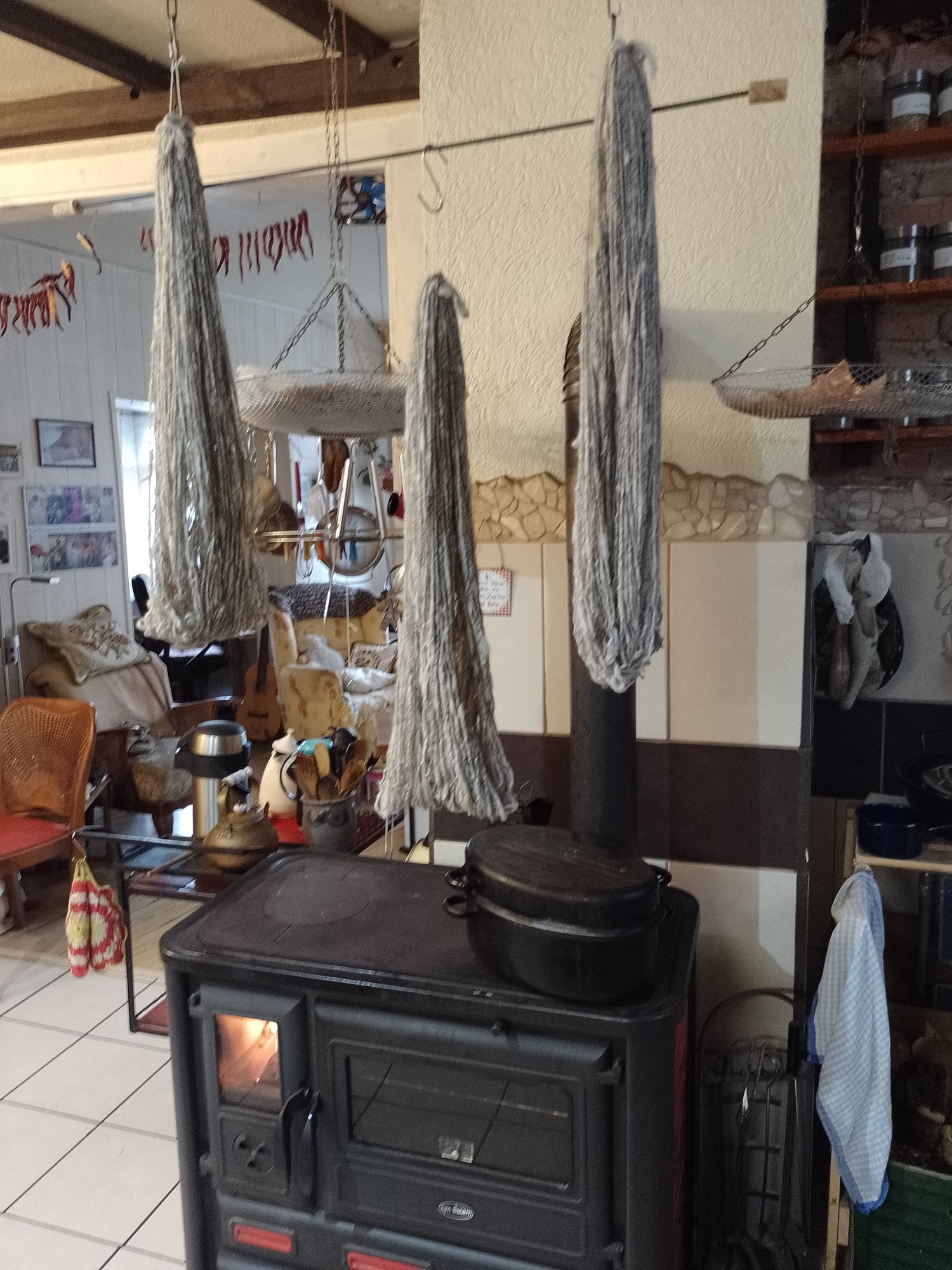 Trocknen dürfen die Wollstränge nach ihrem entspannungsbad über dem warmen OfenMeine größte Hochachtung vor Deinen Werken, egal ob Strickzeug, Spinnerei, Einkochen und Garteln. Da ist ein ungeheuer wertvolles Wissen vereint, in so einer kleinen Person.Drinnen ist es warm, draussen etwas kalt, da habe ich eher kuscheliges im Kopf